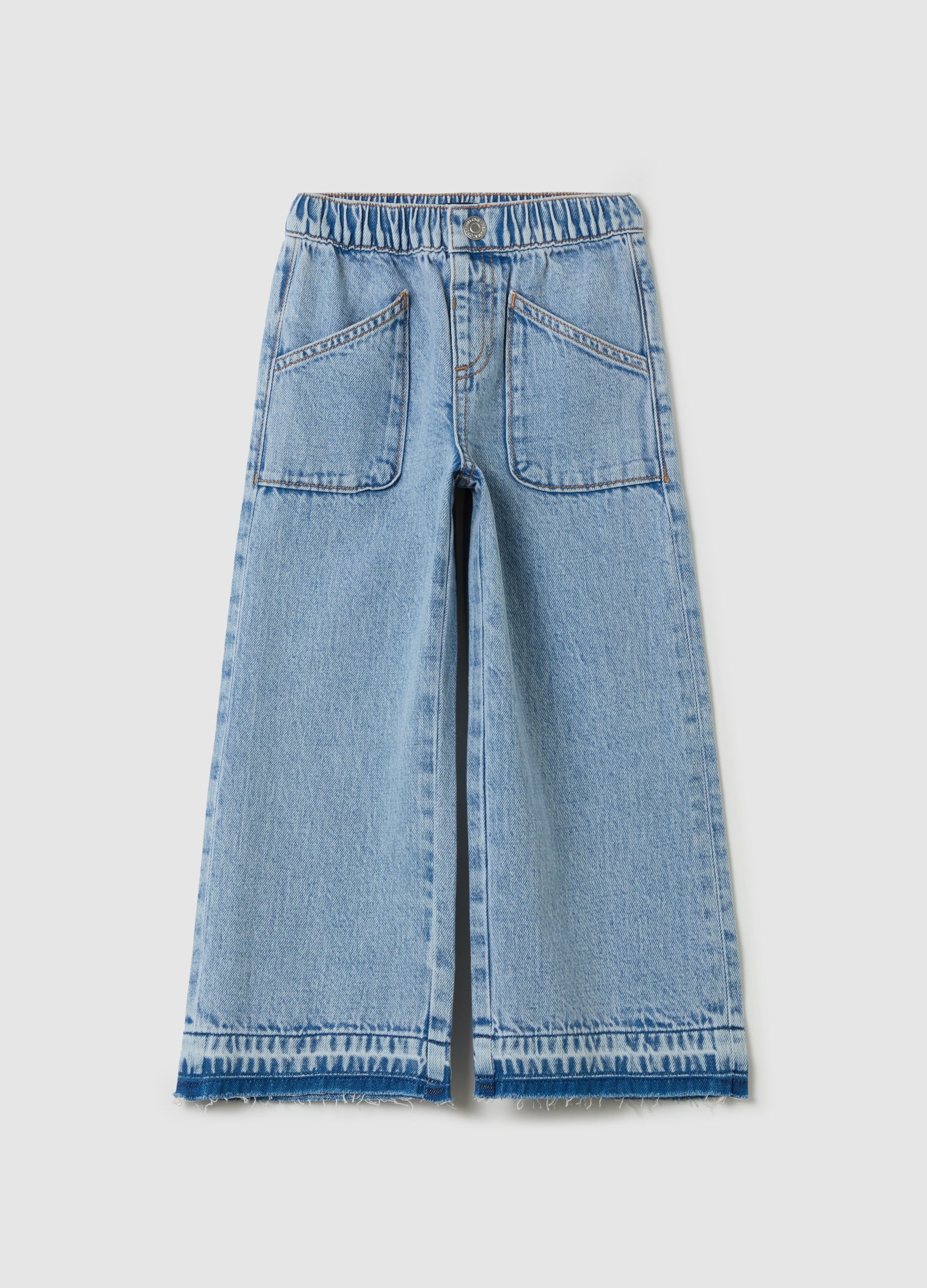 Wide-leg jeans in 100% cotton with mis-dyed effect. Elasticated waist. Two patch pockets on the front and two patch pockets on the back. Frayed hem with raw edge. Snap button fastening.