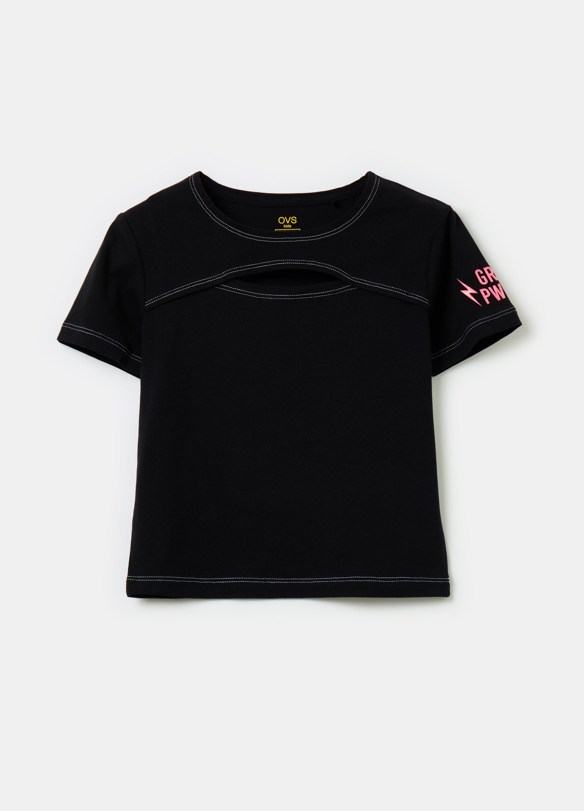 Stretch cotton T-shirt with contrasting stitching. Round neck and cut-out detail on the front. Glitter lettering print with lightening on the sleeve.