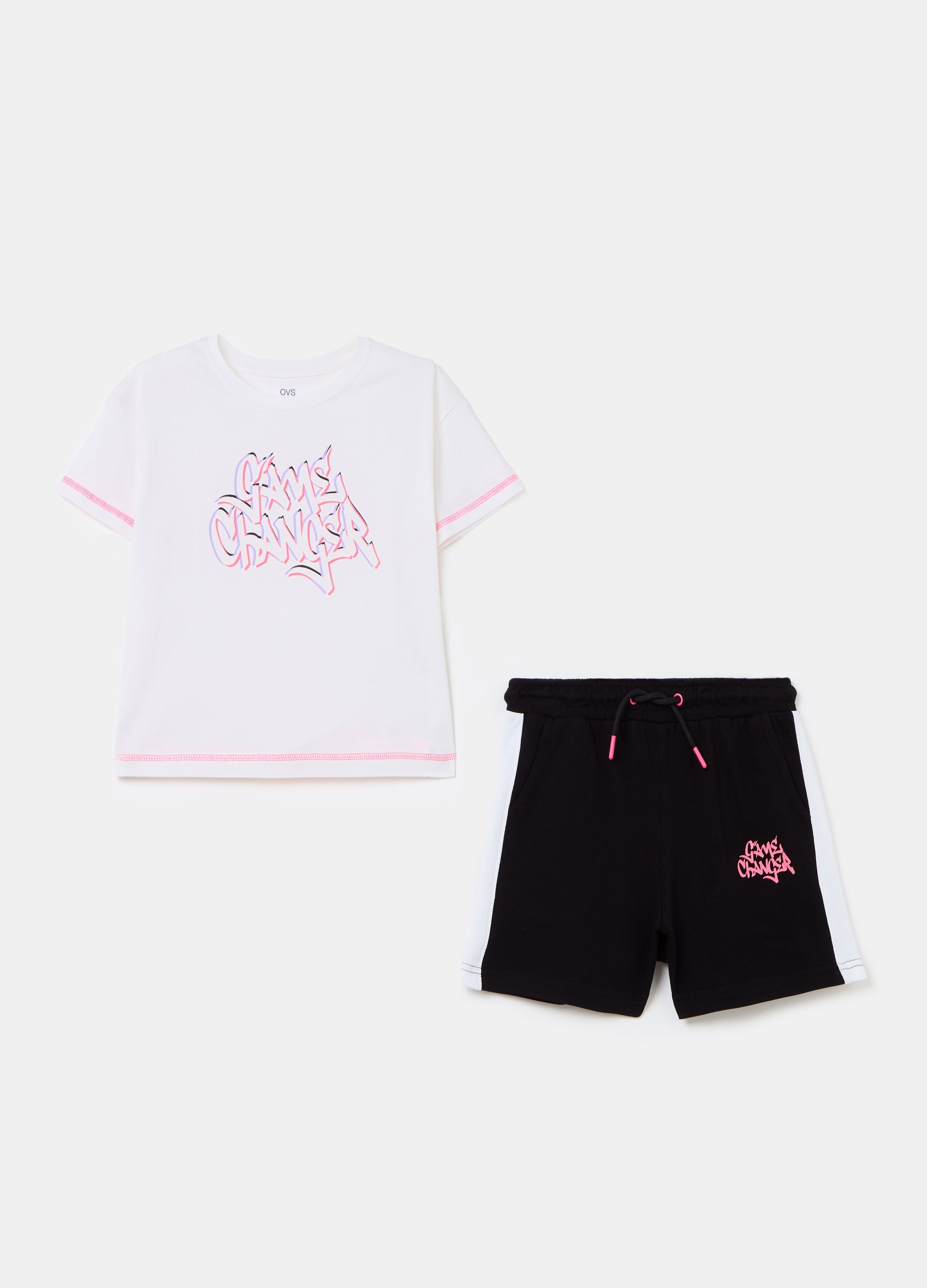 Jogging set in 100% cotton with graffiti-motif lettering print. T-shirt with contrasting stitching and round neckline. Shorts with drawstring waist. Contrasting side bands. Two slant pockets.
