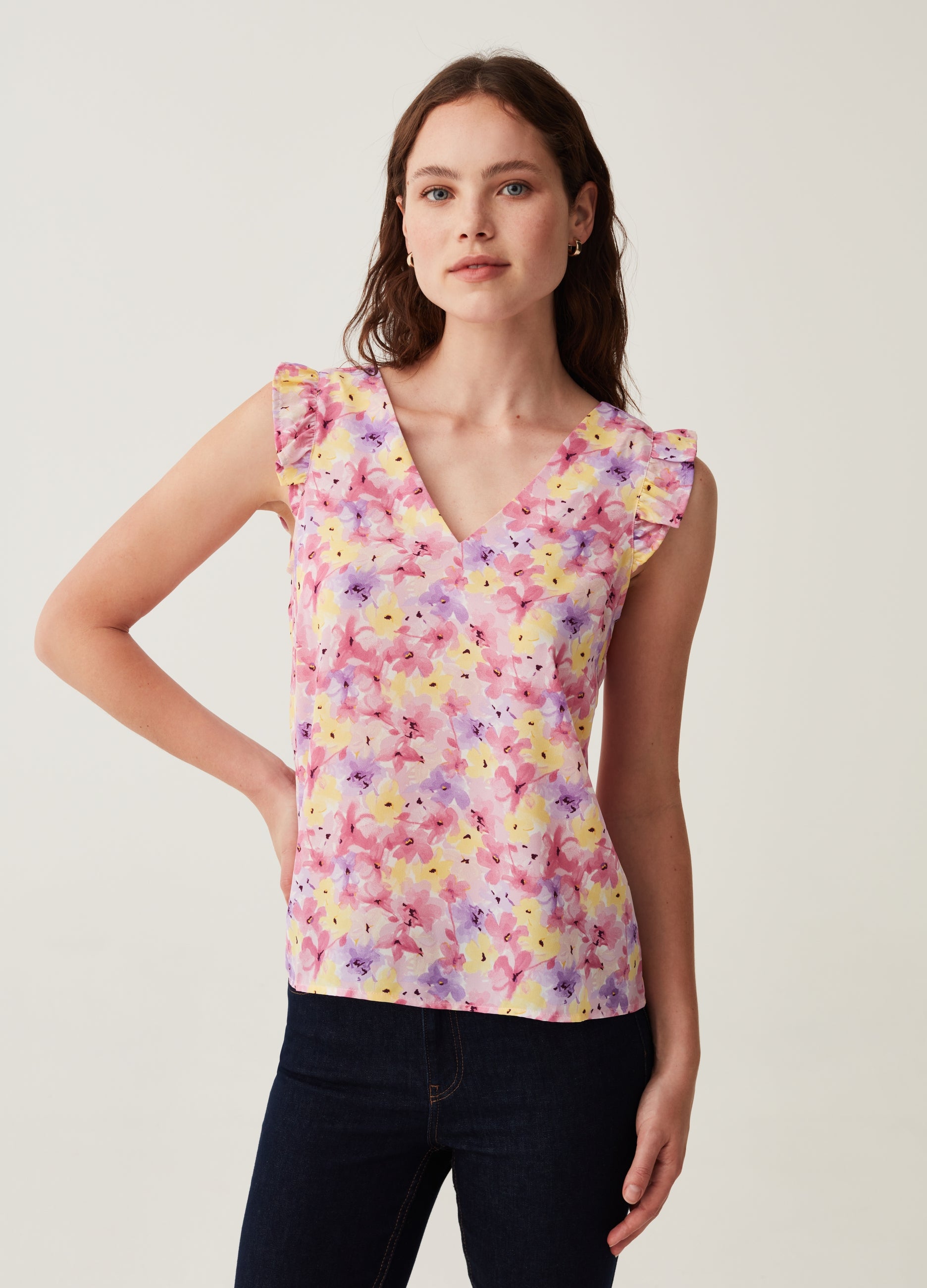 Blouse with floral pattern. V-neck. Flounces on the arm openings. Laces tied on the back.