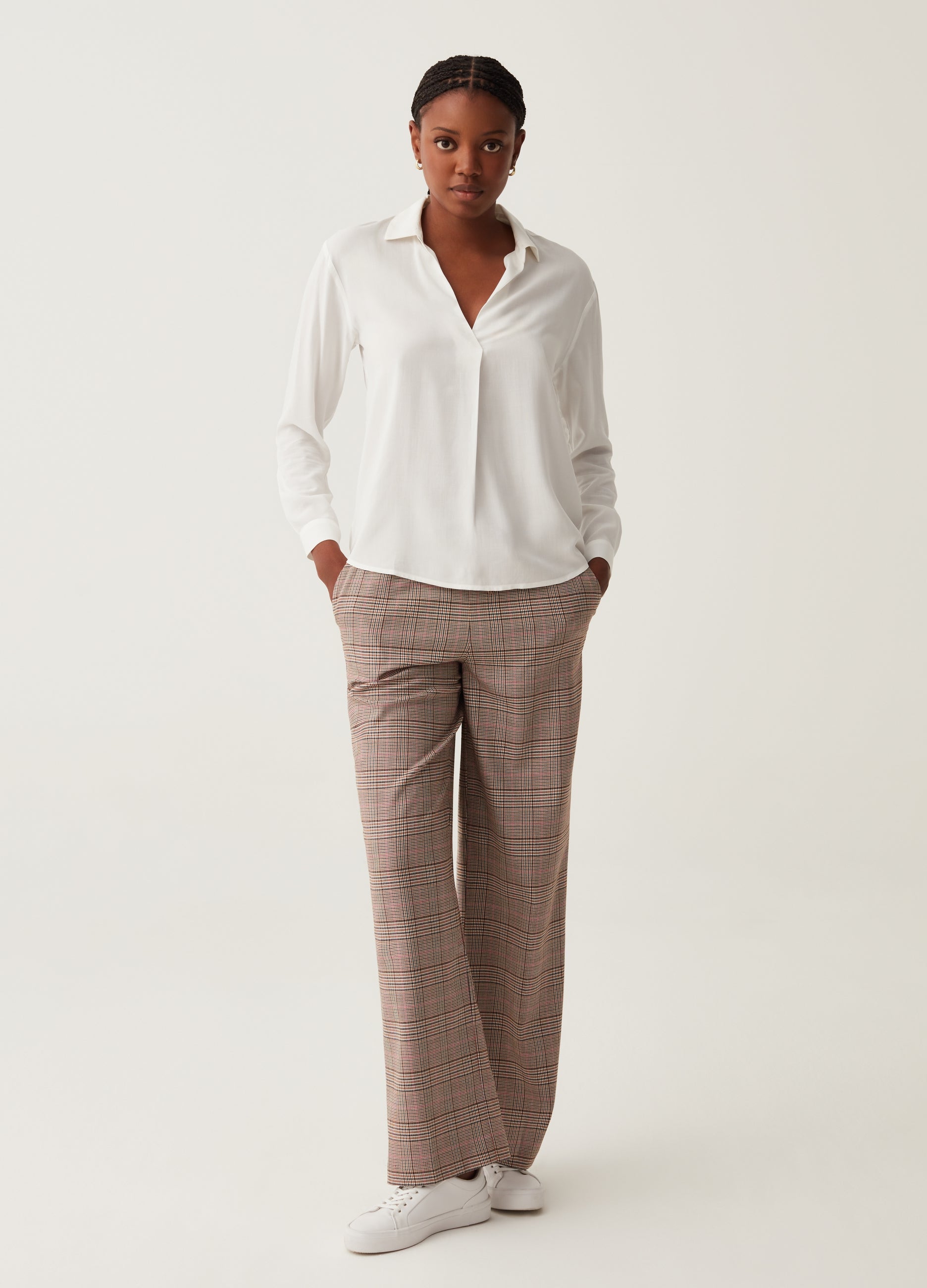 Joggers in stretch viscose blend fabric with drawstring. Prince of Wales pattern. Two slant pockets.