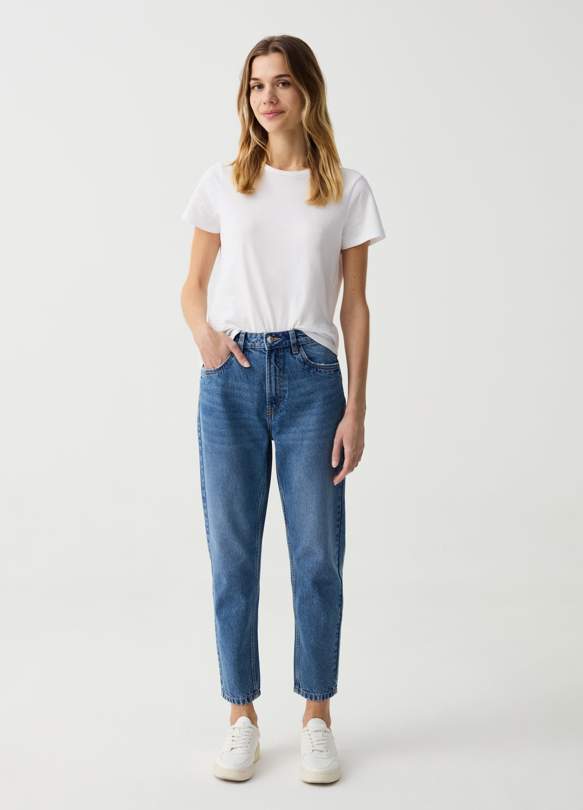 Mum-fit jeans in 100% recycled cotton with acid wash treatment and fading. High waist. Five pockets. Zip and button fastening. Above ankle length.