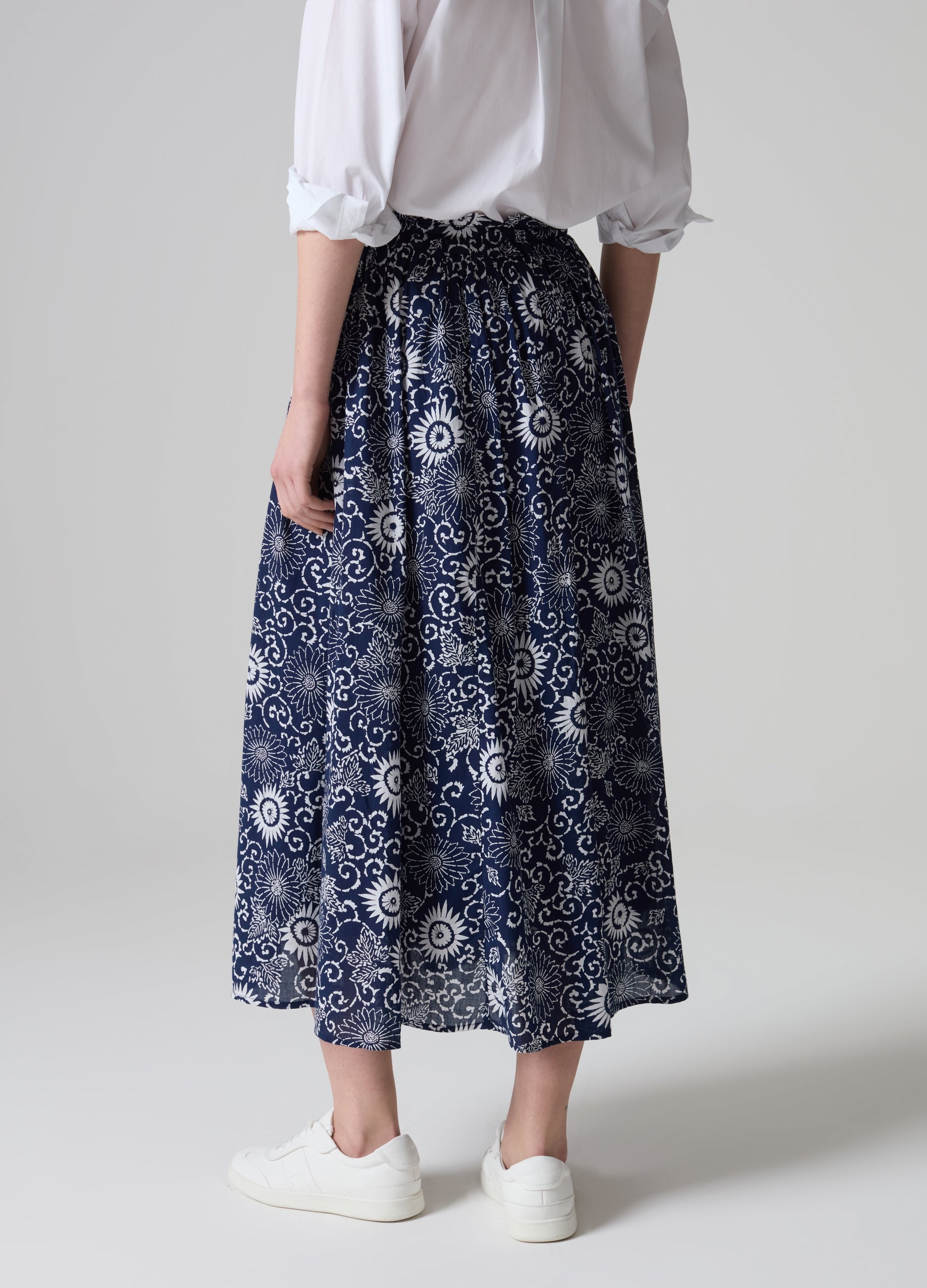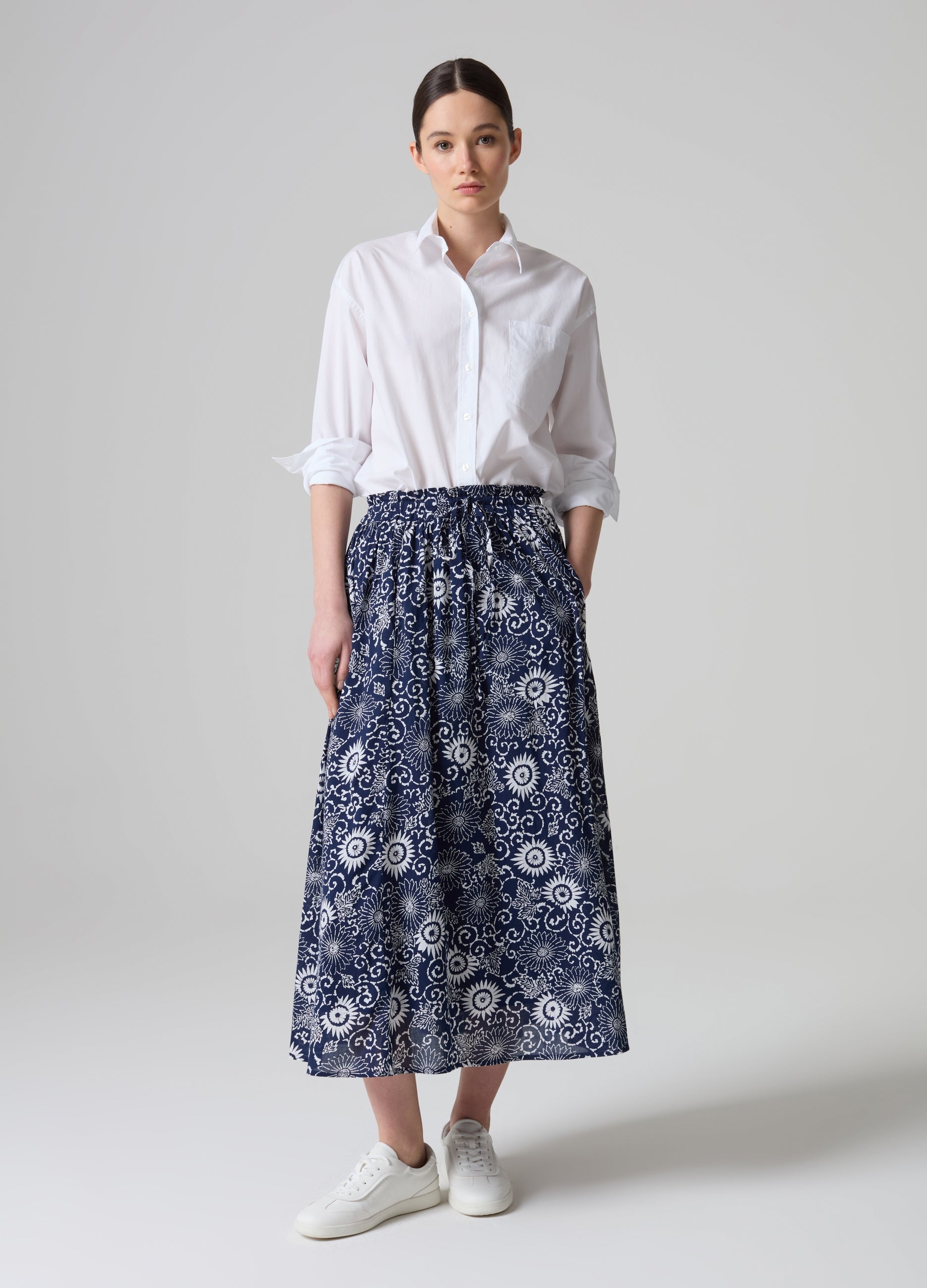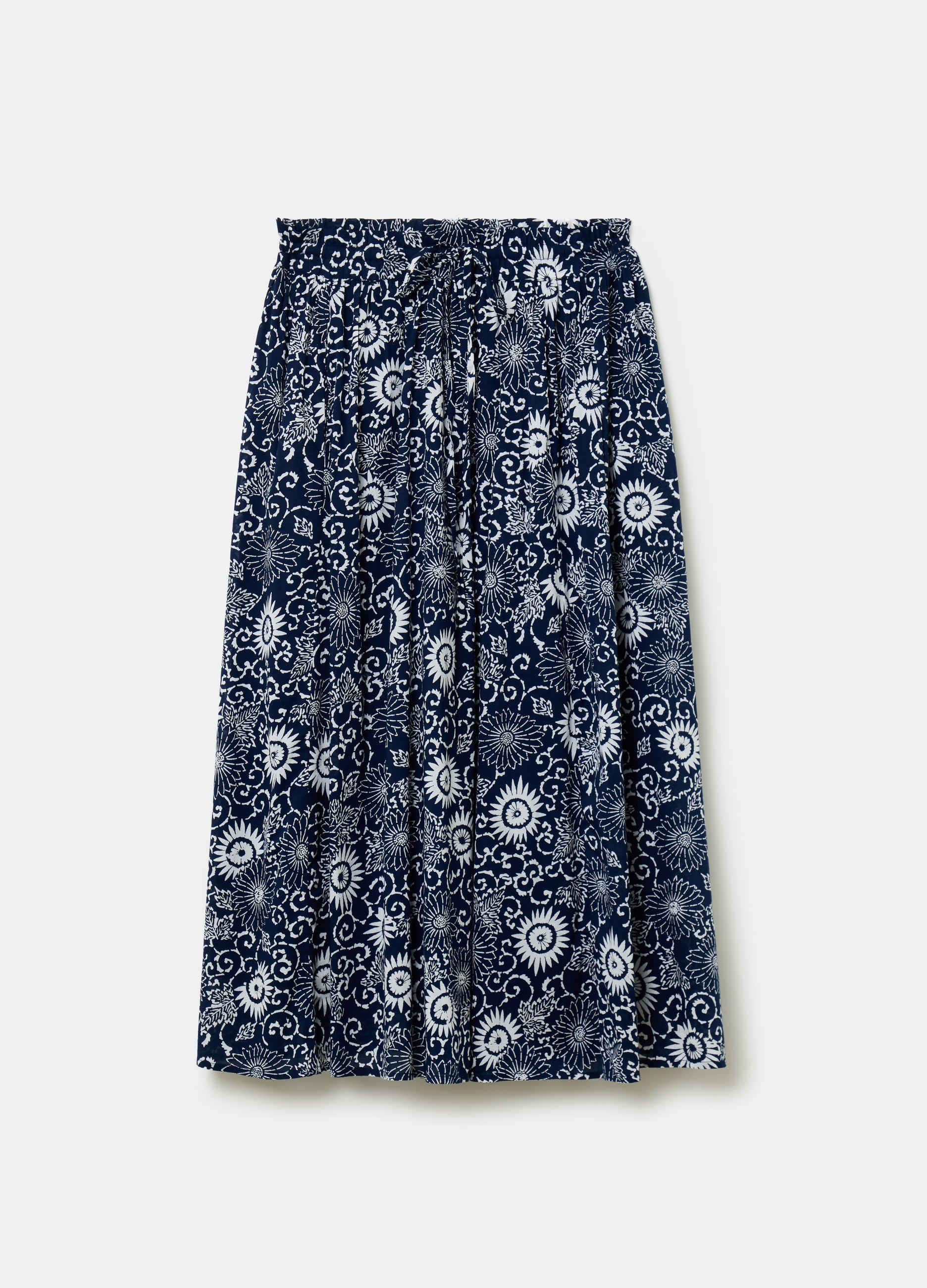 PIOMBO full midi skirt in 100% cotton. All-over floral print. High elastic waist band with drawstring. Two vertical pockets.