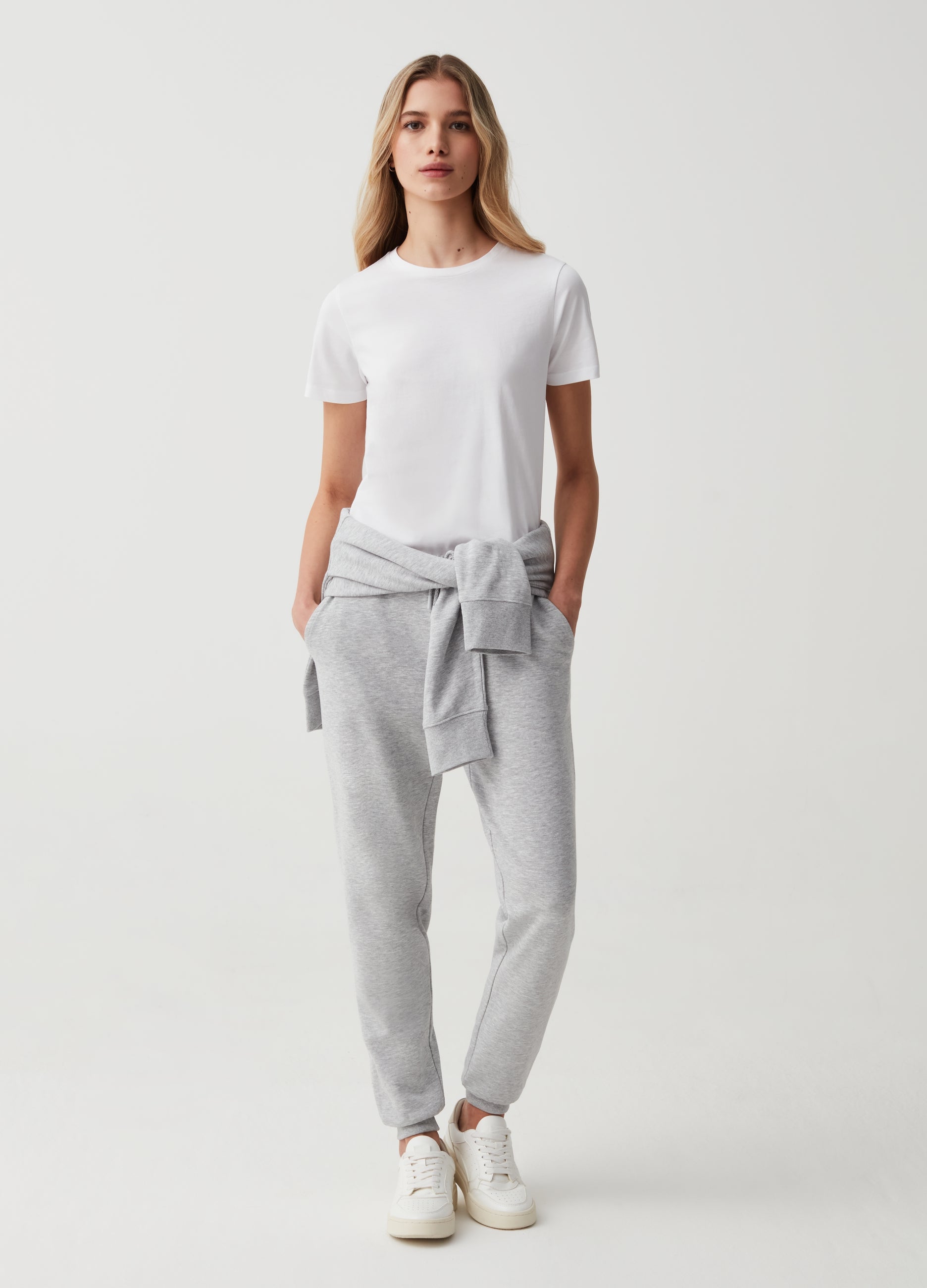 Essential joggers in viscose and cotton blend French terry. Drawstring waist. Two vertical pockets. Elasticated ankles.