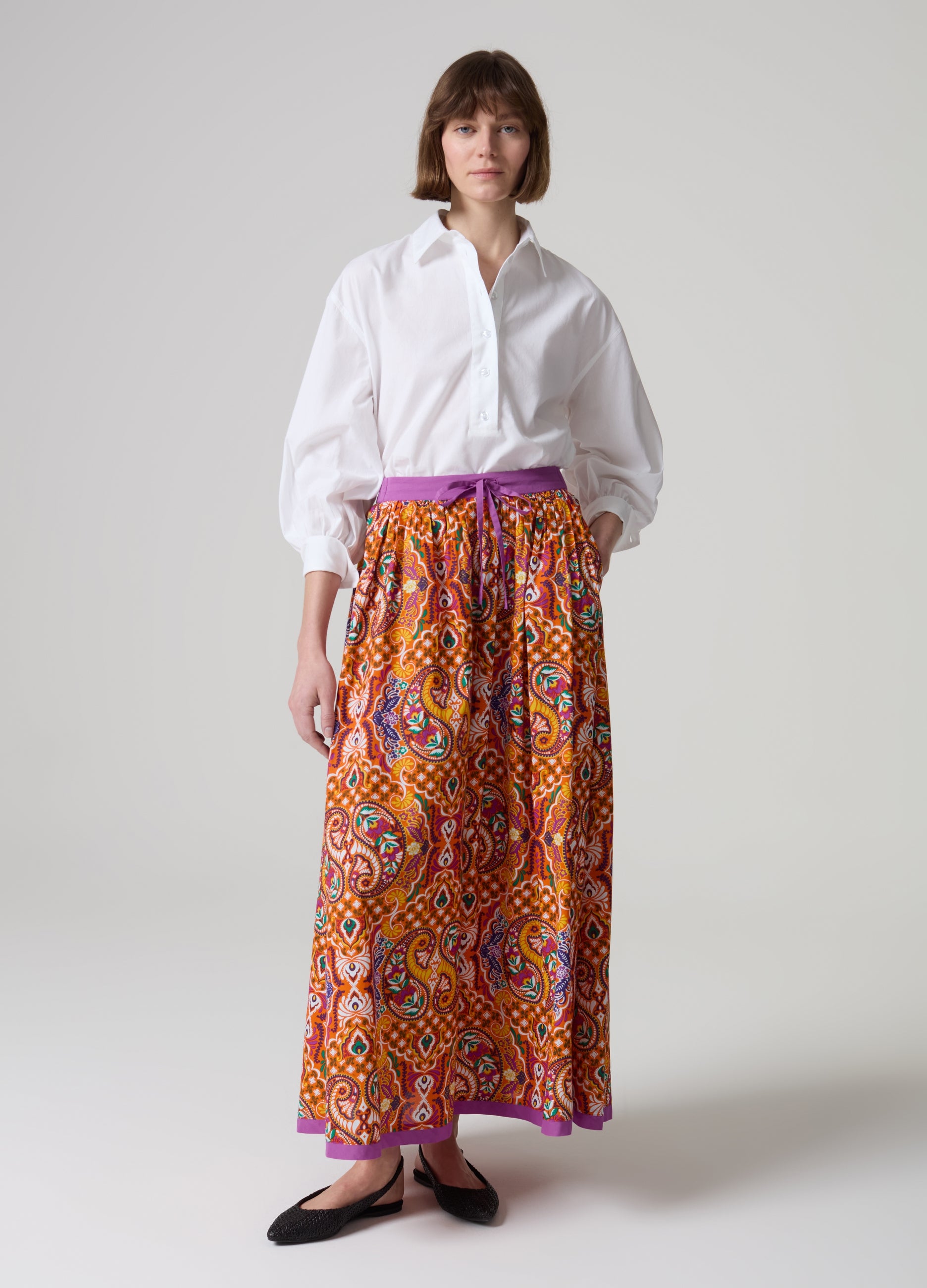 PIOMBO long 100% cotton skirt. Paisley pattern. Contrasting high waist with drawstring. Two vertical pockets.