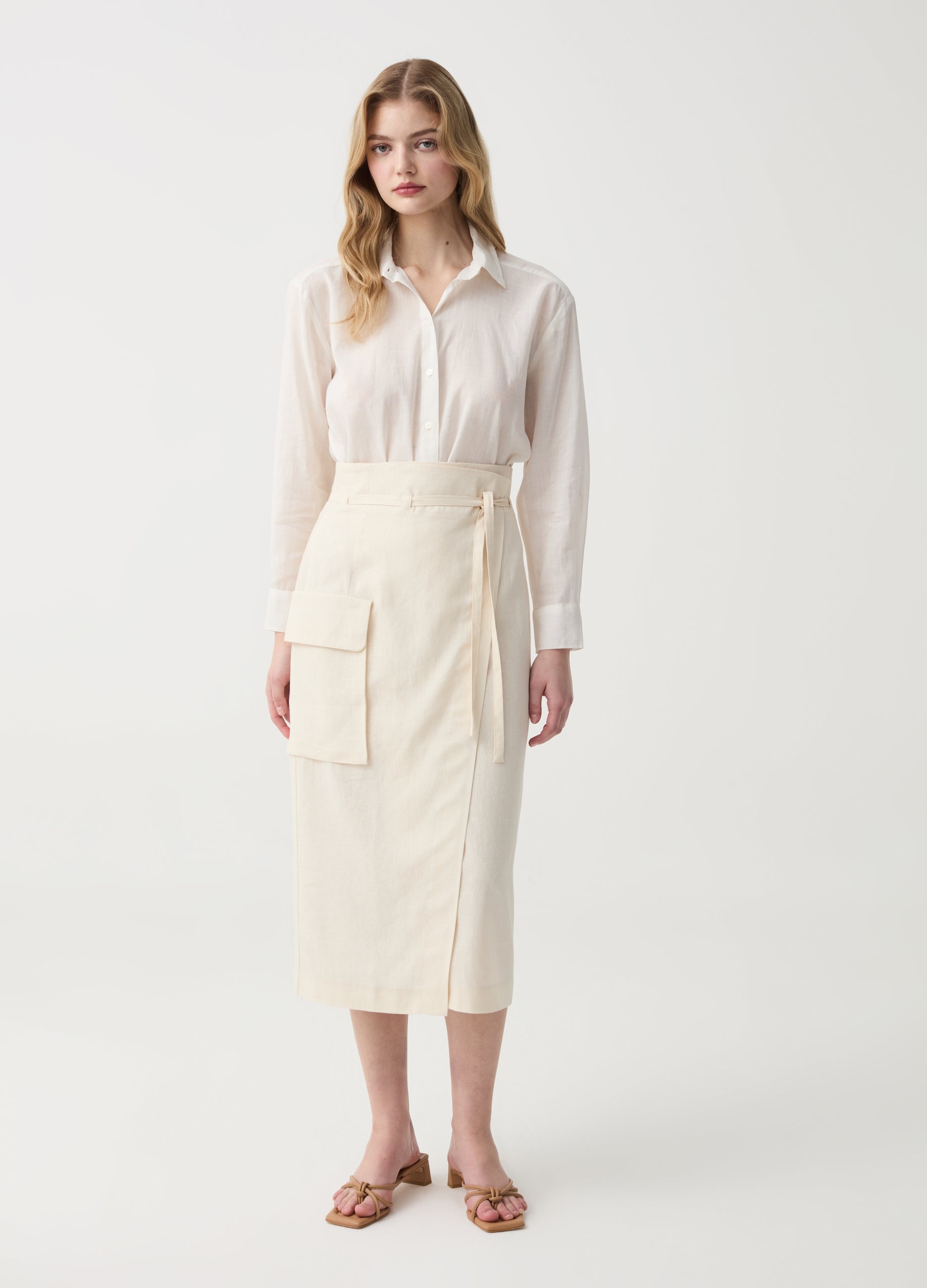 Combat model midi skirt in linen and viscose. High waist. Maxi patch pockets with flap on the side and two welt pockets on the back. Wraparound fastening with belt tied on the side.