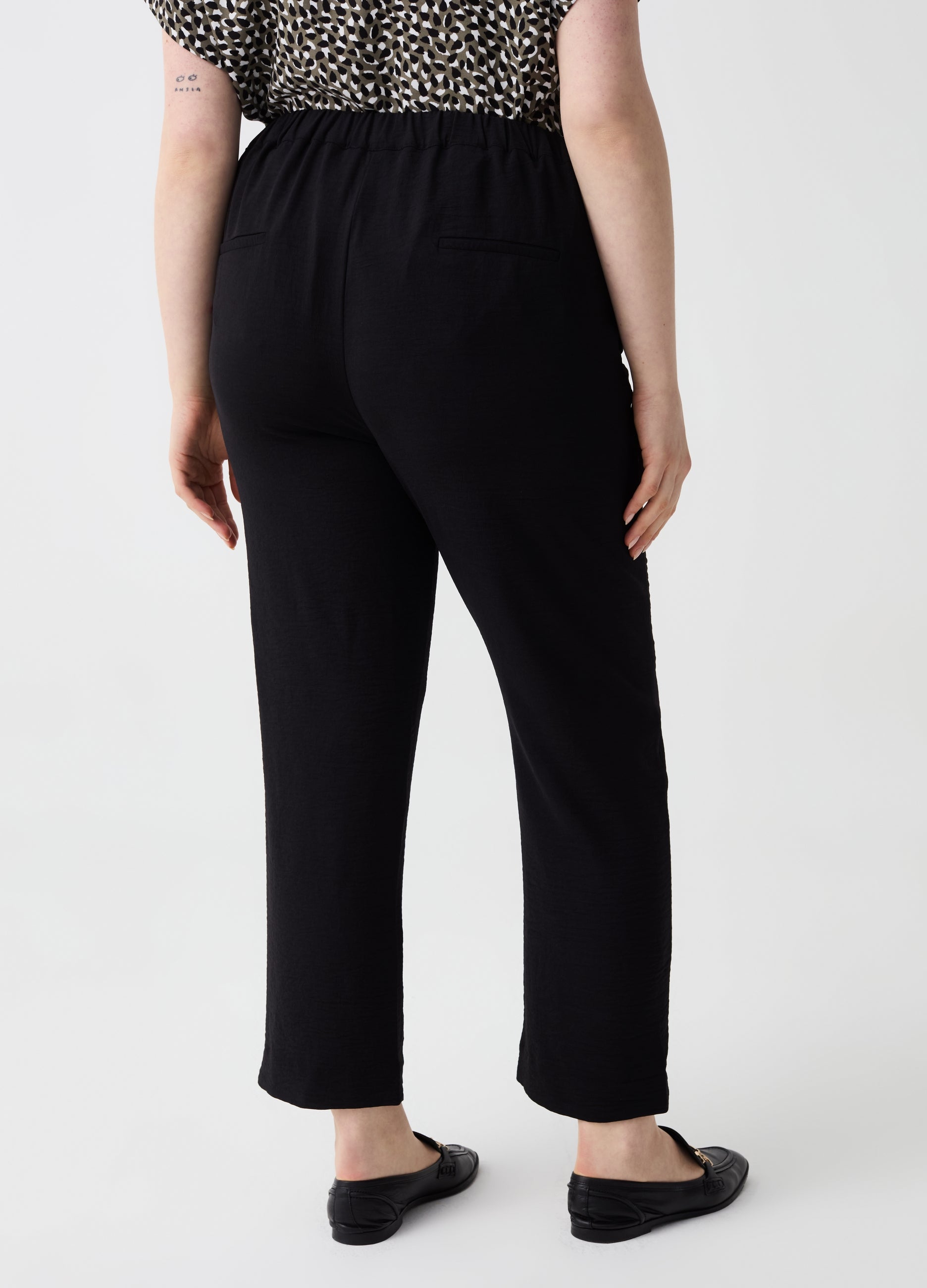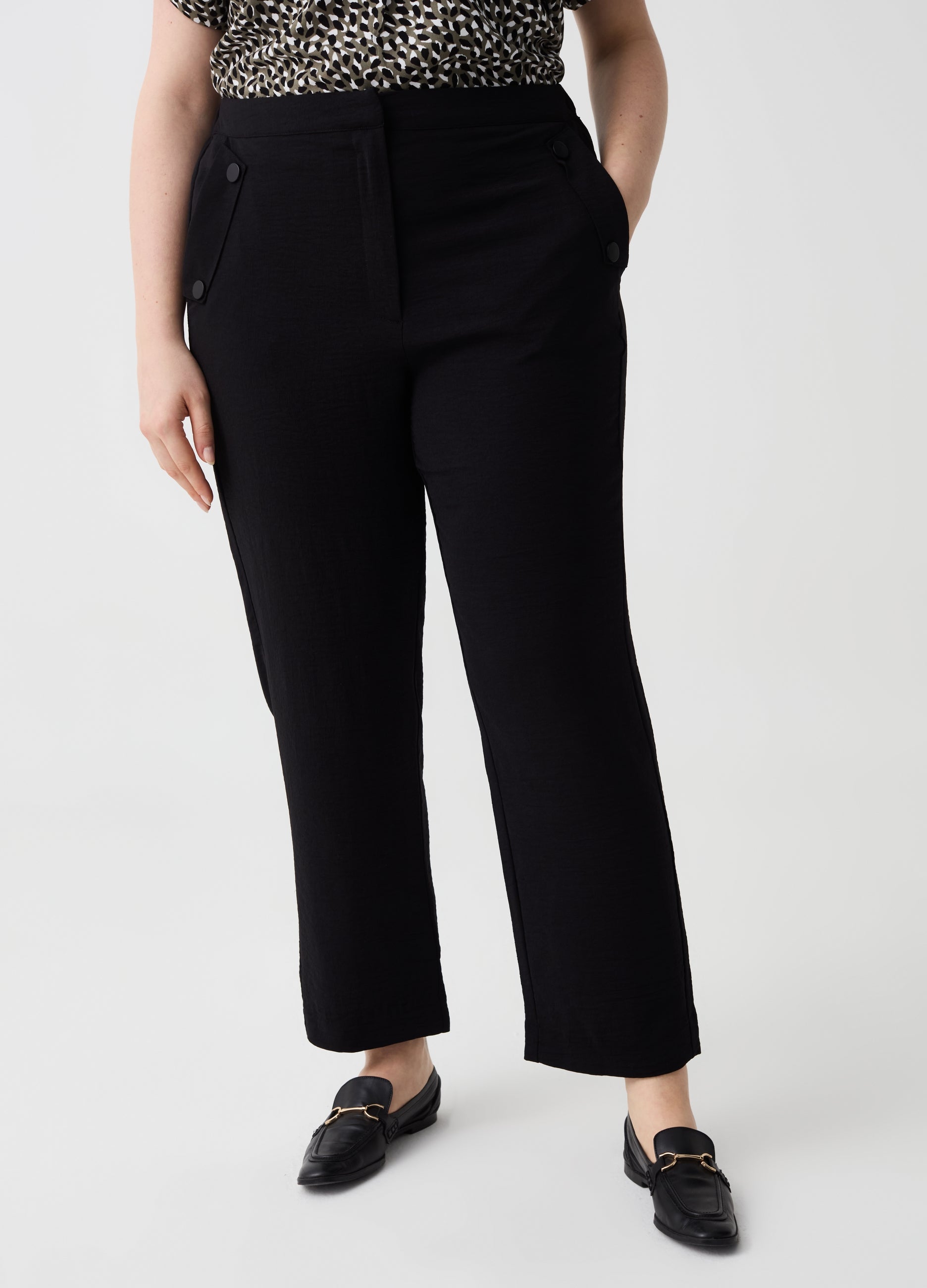 MYA Curvy cigarette trousers in recycled polyester. Elasticated waist on the back. Two side pockets with false buttons and two welt pockets on the back.