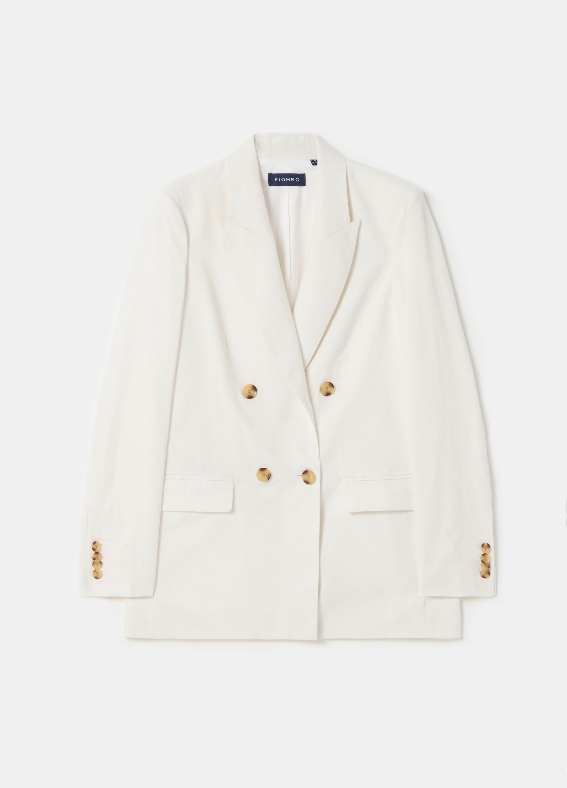 PIOMBO Contemporary blazer in sustainable viscose and linen. Viscose blend lining. Two horizontal pockets with flap. Buttons on cuffs. Double-breasted button fastening.