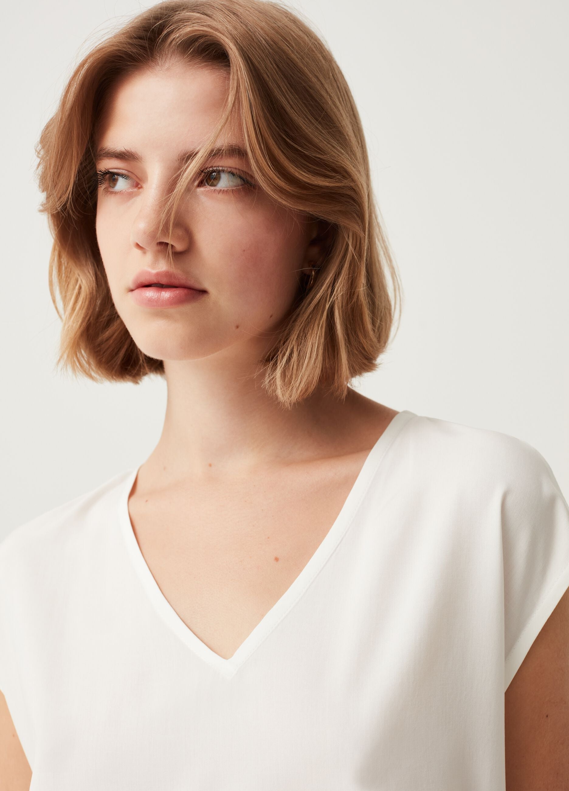 Solid colour 100% viscose blouse. V-neck. Short kimono sleeves.