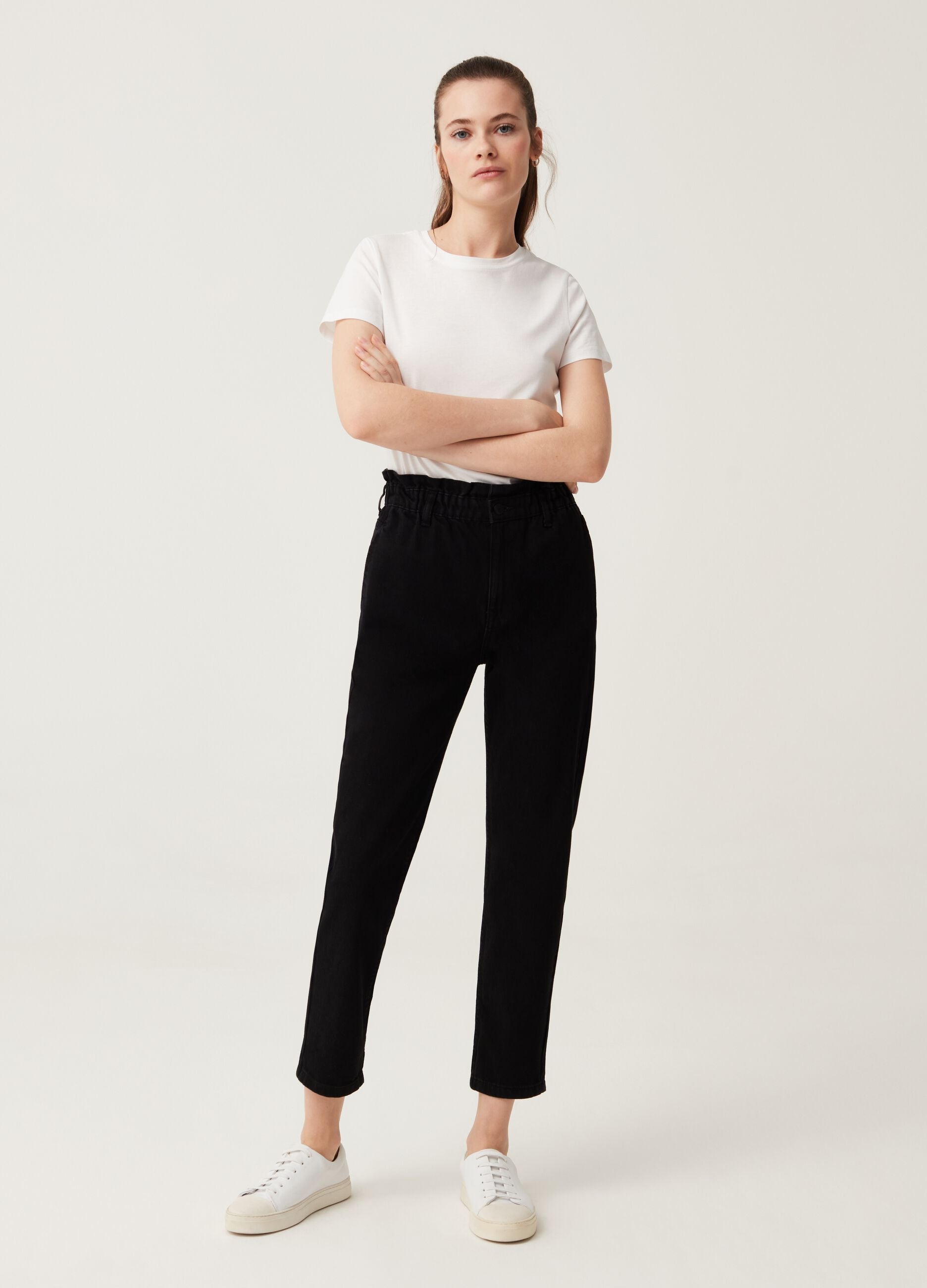Slouchy-fit jeans in 100% cotton. High elastic waist with frills. Two vertical pockets and two patch pockets on the back. Zip and button fastening.