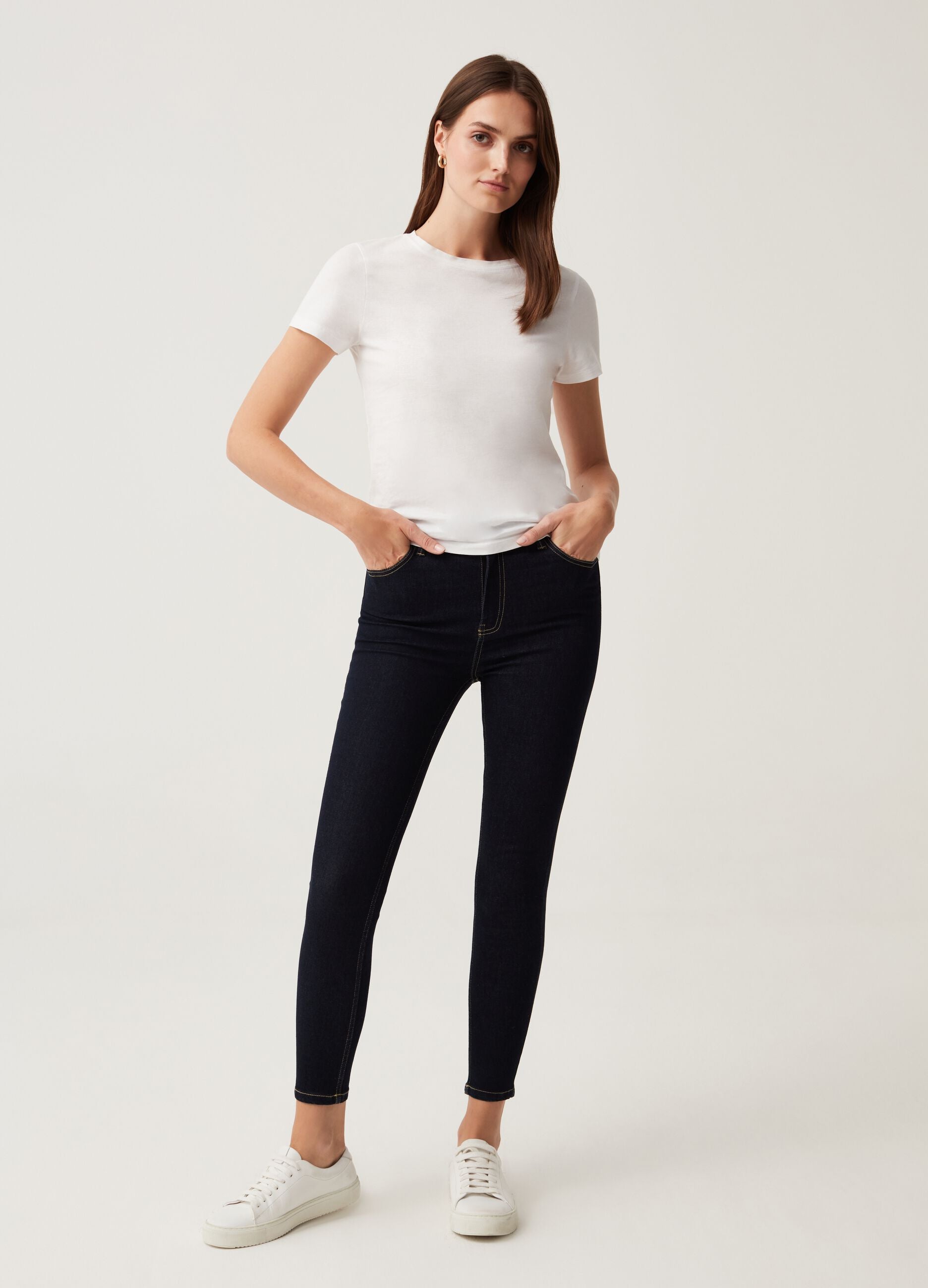 Skinny-fit jeans in stretch viscose and cotton blend. Above the ankle length. Five pockets. Zip and button fastening.