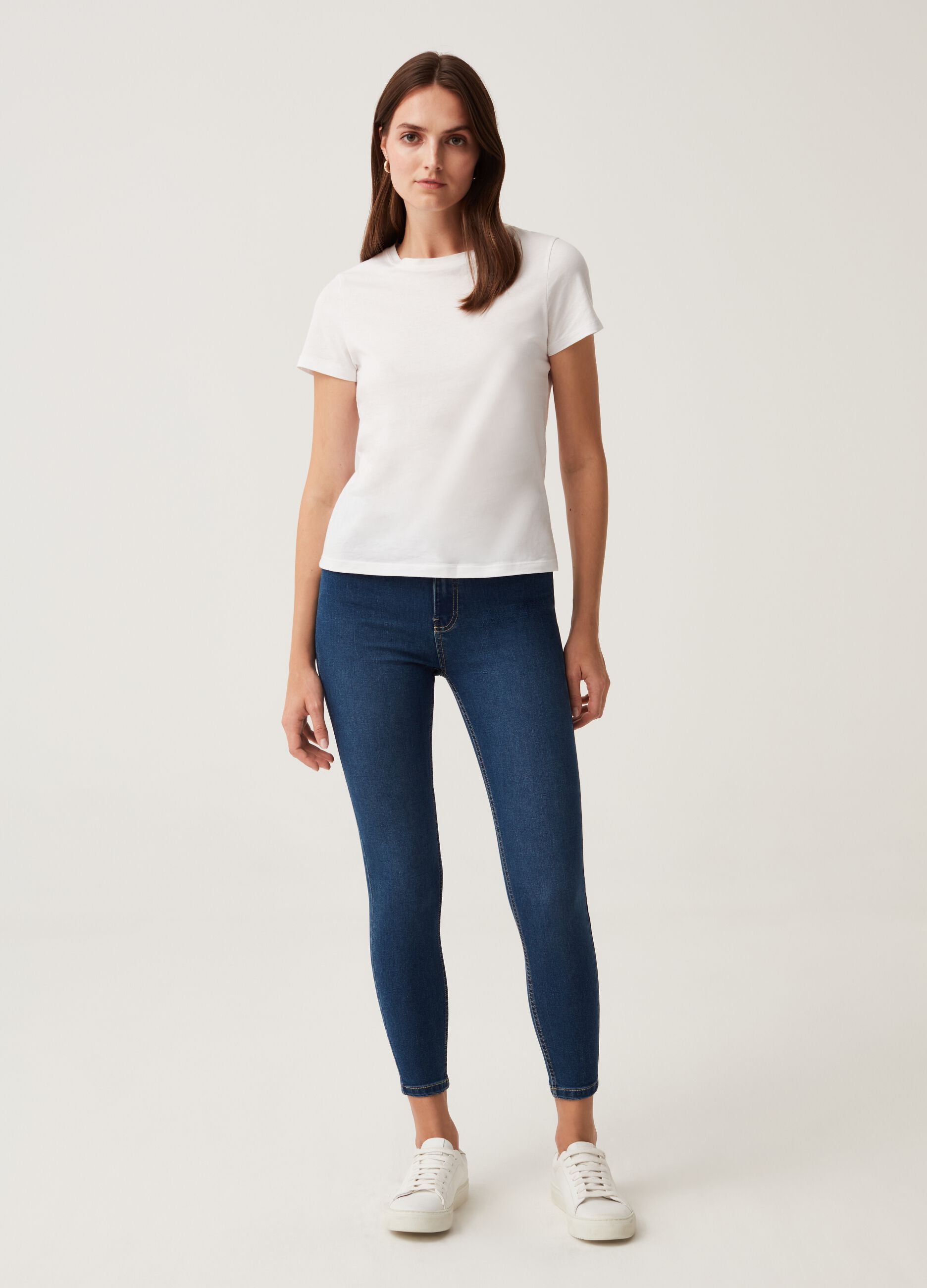 Skinny-fit jeans in stretch viscose and cotton blend. Above the ankle length. Five pockets. Zip and button fastening.