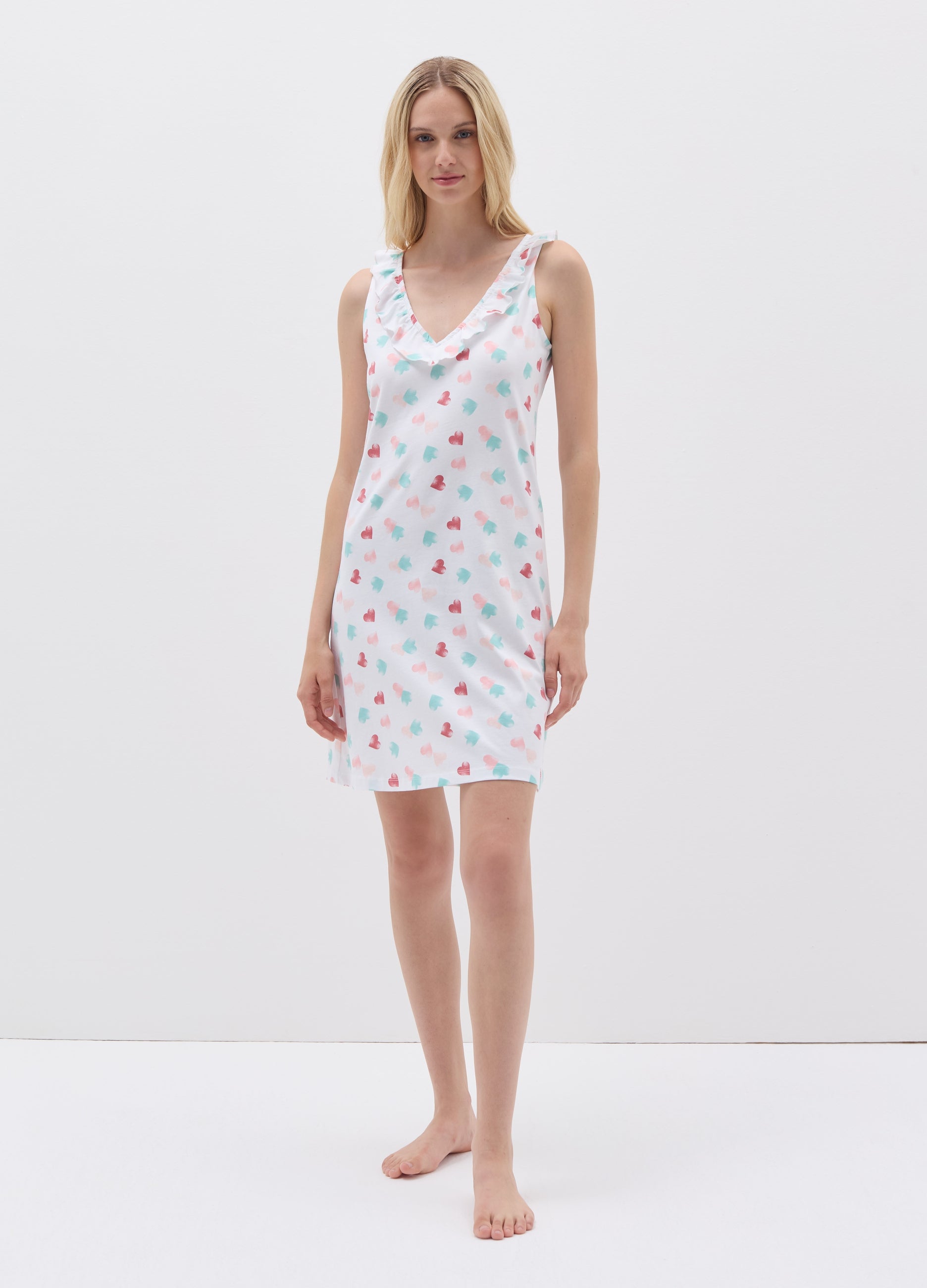 100% organic cotton sleeveless nightdress. All-over multicoloured hearts print. V neck with frilled trim. Midi length.