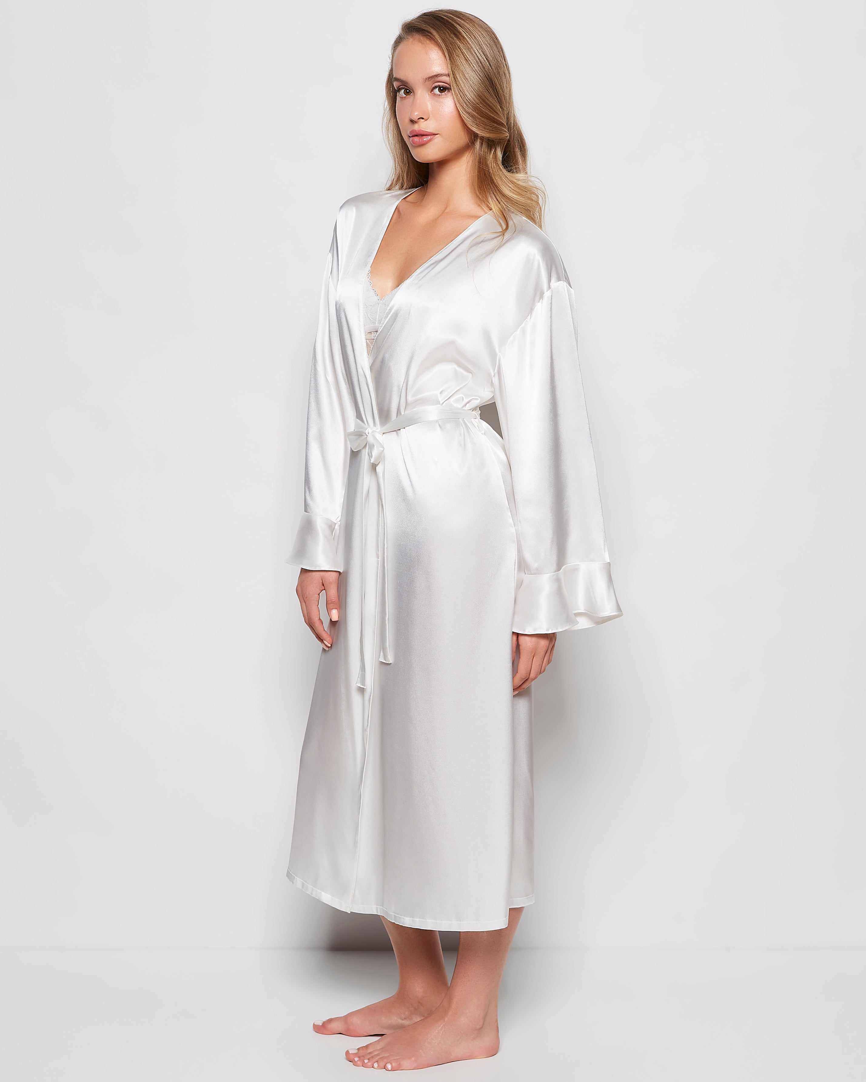 Pamper yourself in this Ivory Satin Mid Length Robe. Designed with long sleeves and a mid length, it’s perfect for relaxing and enjoying a night in.