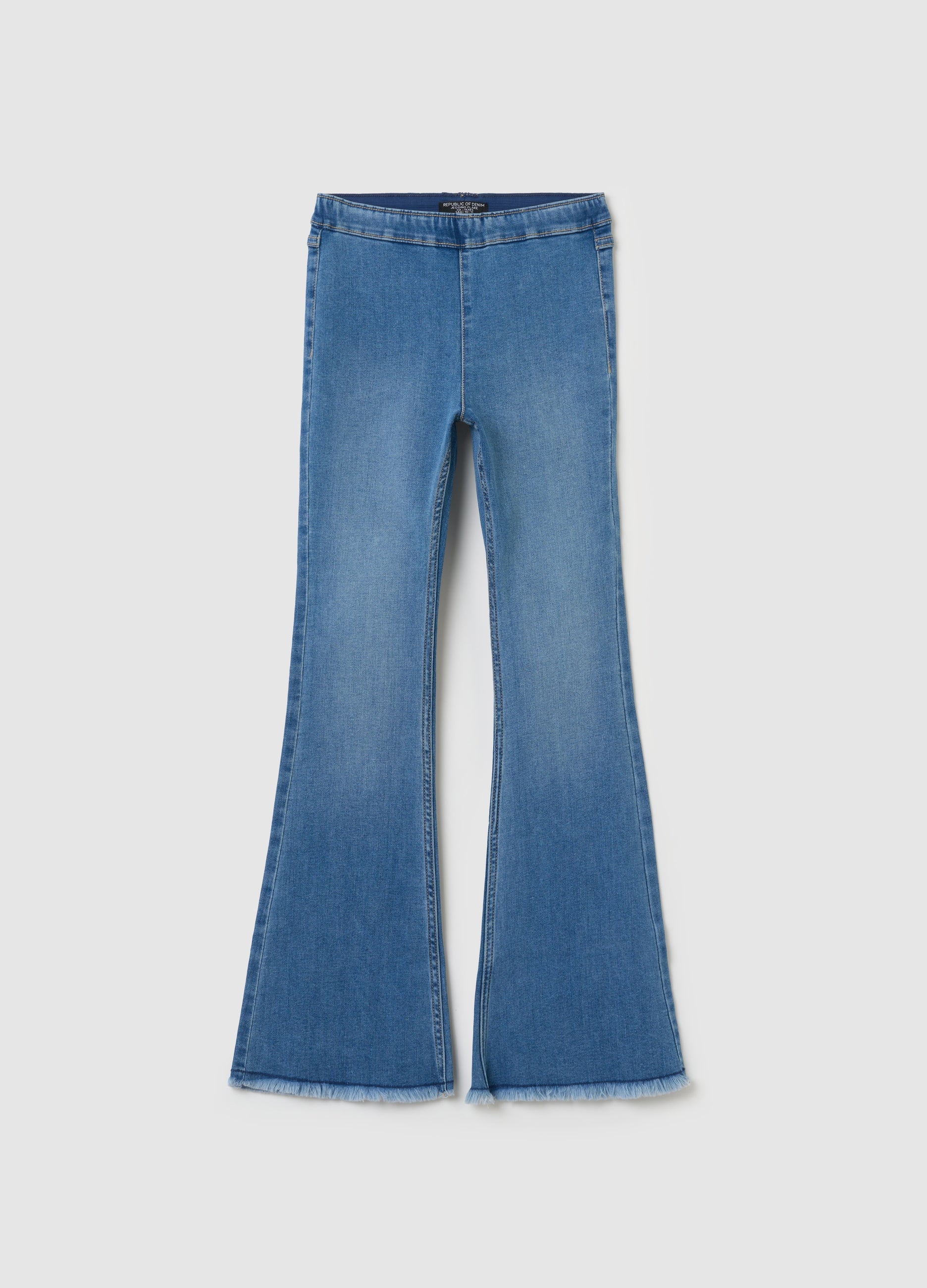 Flare-fit jeggings in stretch viscose and cotton blend. Elasticated waist. Two back patch pockets. Fringed hem.