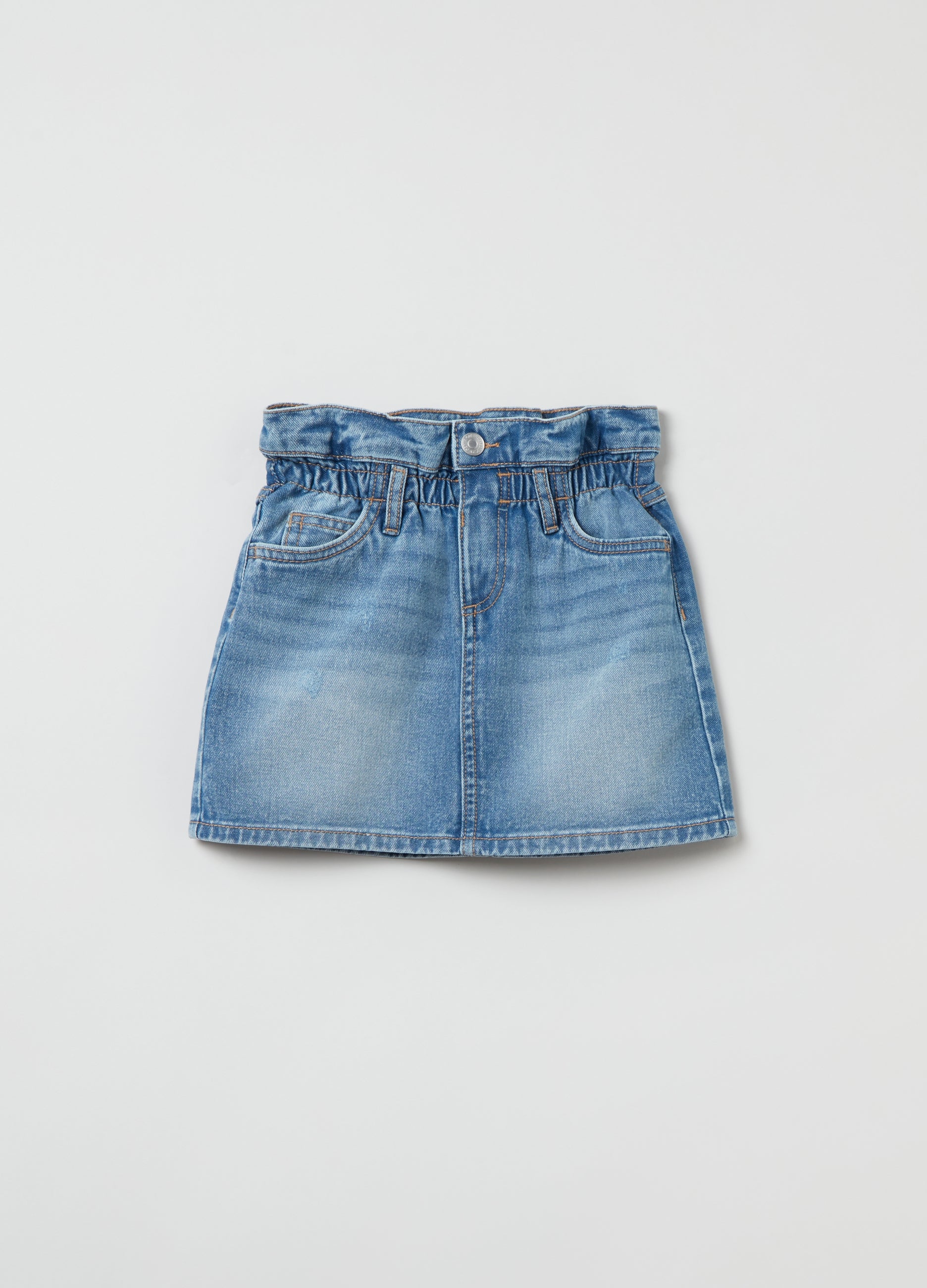 Slouchy-fit miniskirt in 100% cotton denim with faded effect. Elasticated and gathered waist. Five pockets. Zip and button fastening.