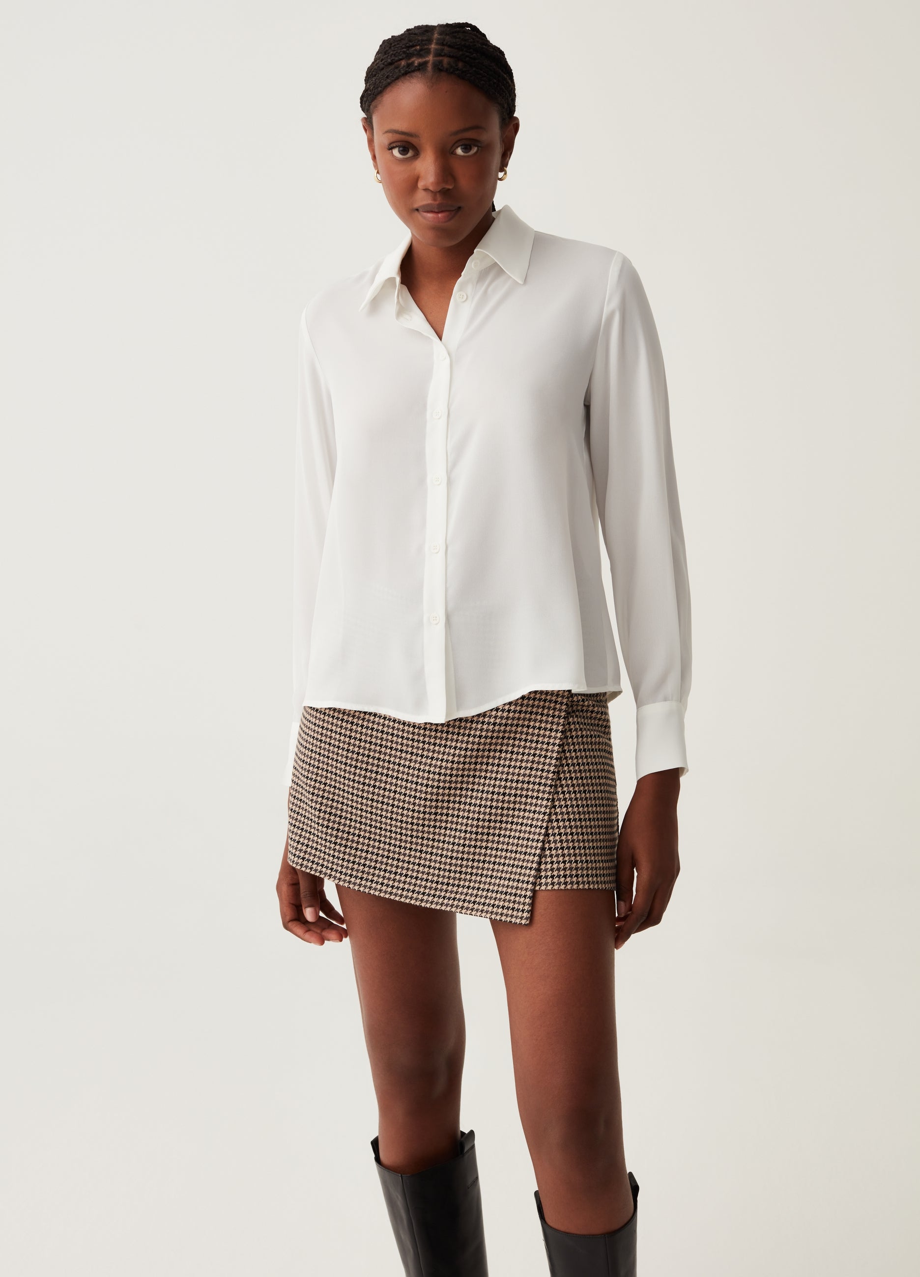 Solid colour crêpe shirt. Bluff collar. Yoke on the back and dart seams. Button cuffs. Button fastening.
