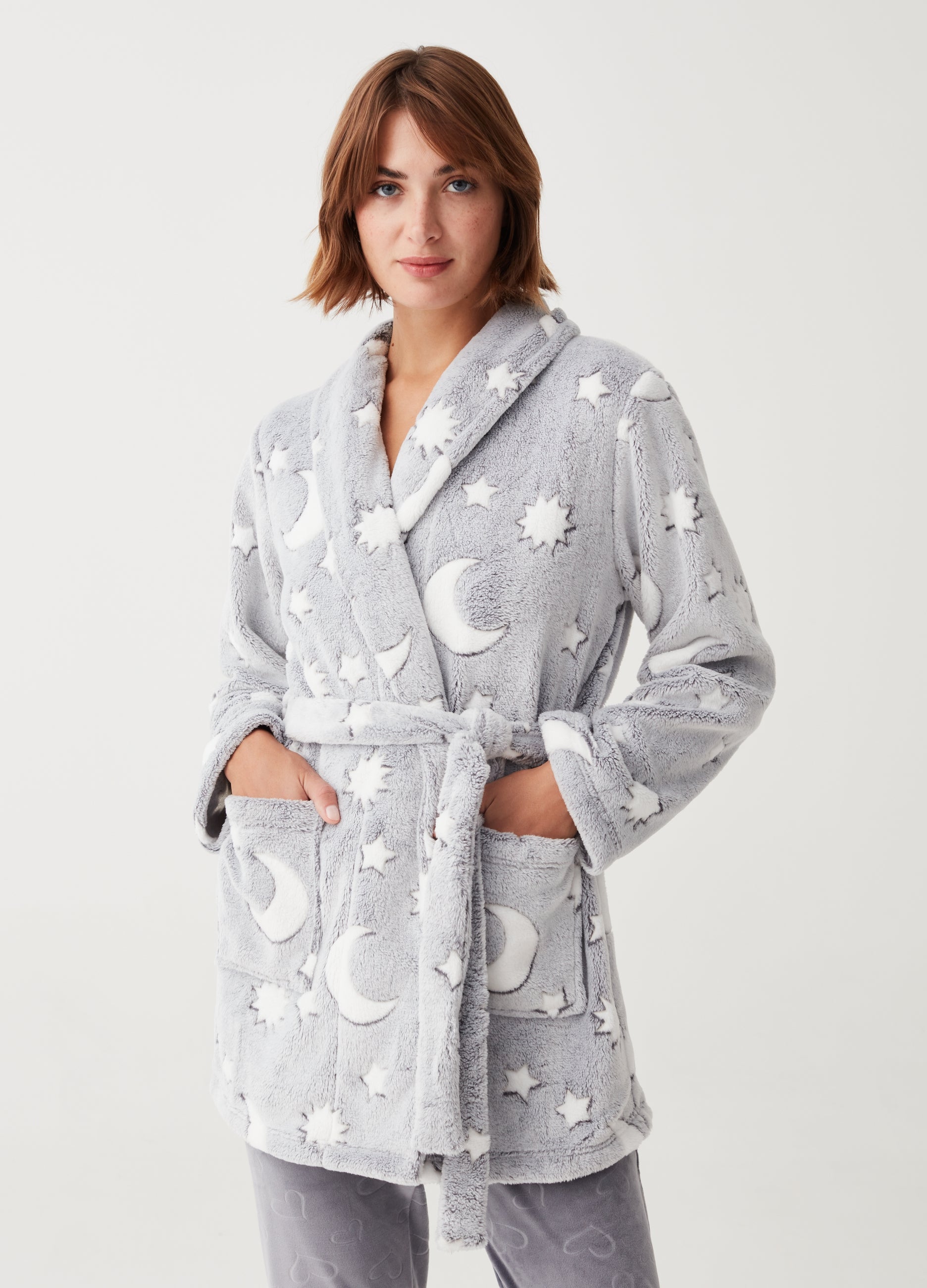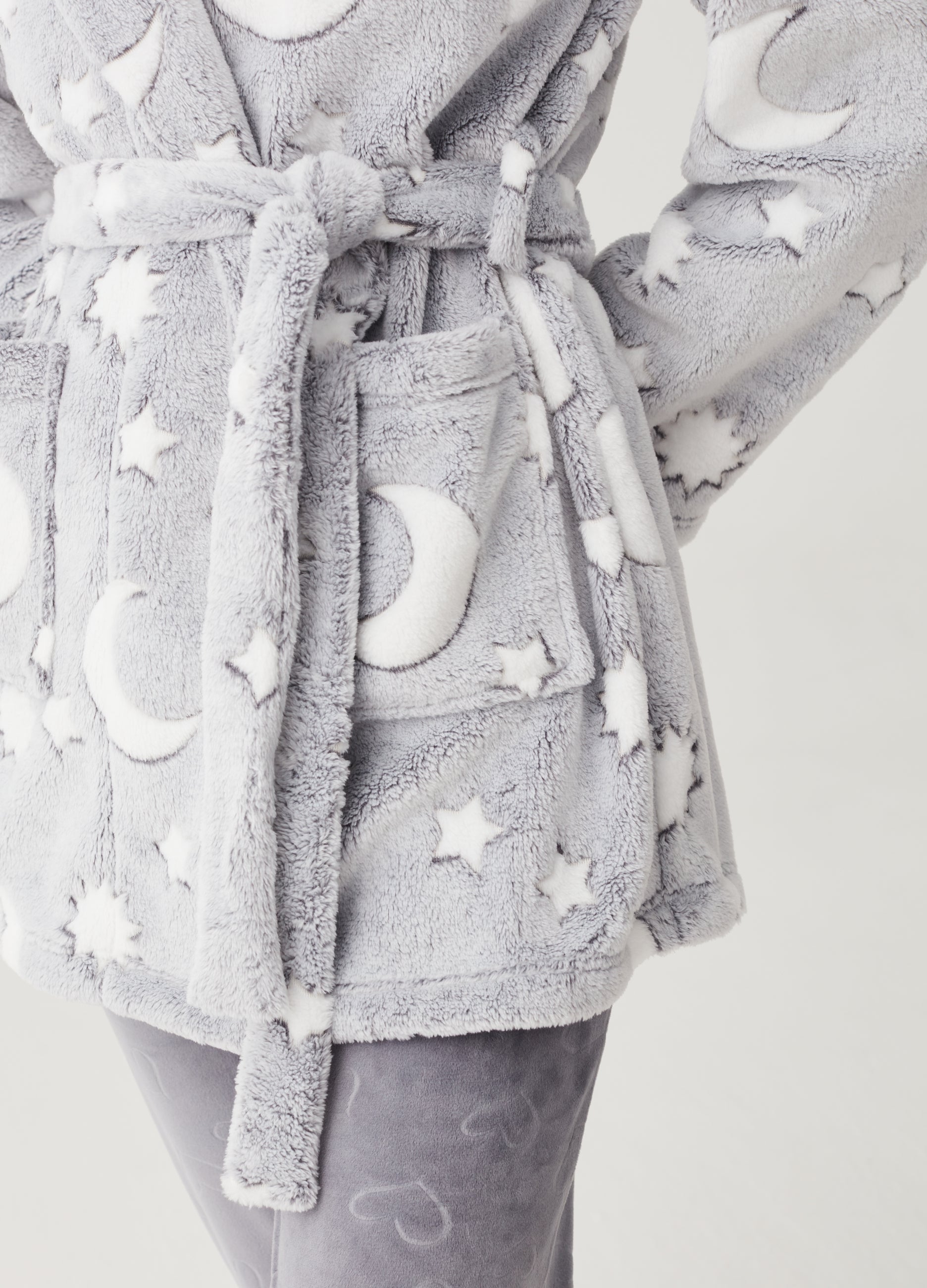 Short velour robe with stars and moon print. Two patch pockets on the sides. Waist tie