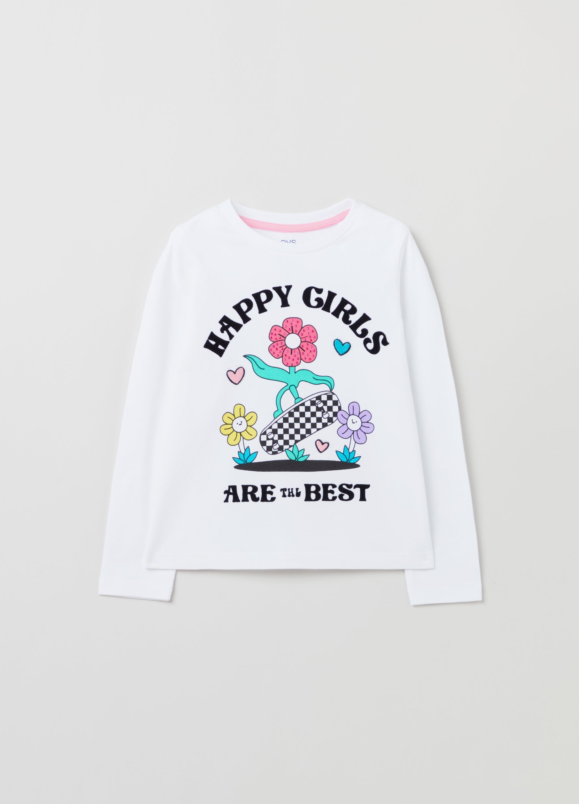 Long-sleeved T-shirt in stretch cotton. Round neck. Skater floral print with diamanté appliqué and flock lettering.