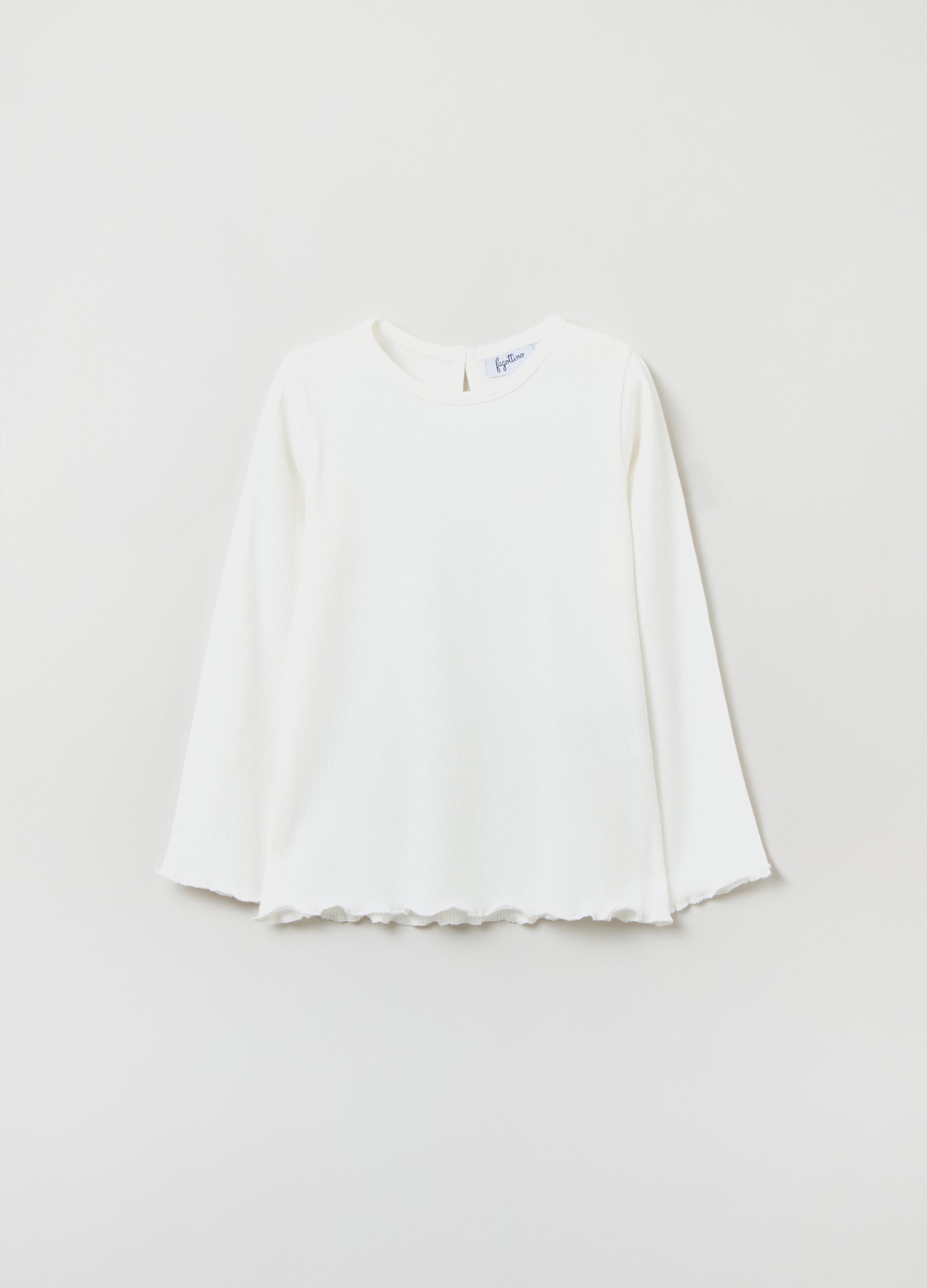 Long-sleeved T-shirt in ribbed stretch cotton. Round neck. Scalloped cuffs and hem. Keyhole opening with button fastening on the back.