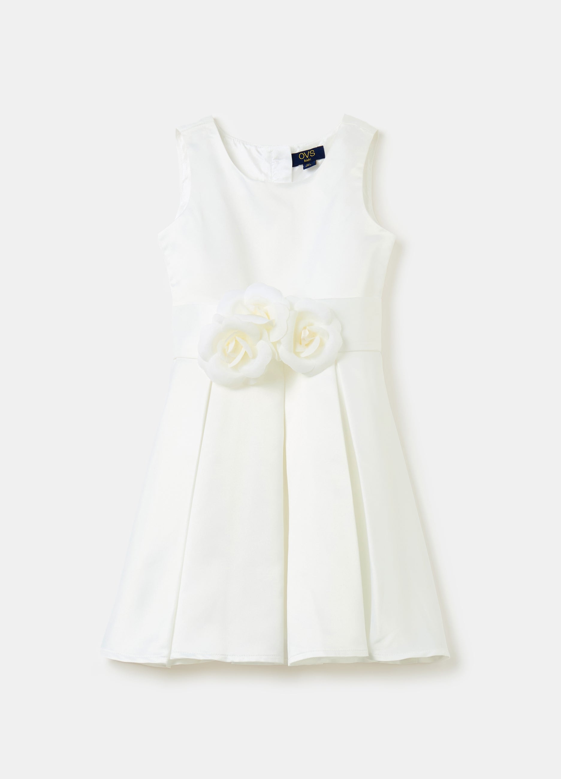 Sleeveless dress in satin. Round neck. Ribbon tied at the waist with matching flowers. Skirt with darts. Zip fastening on the back.