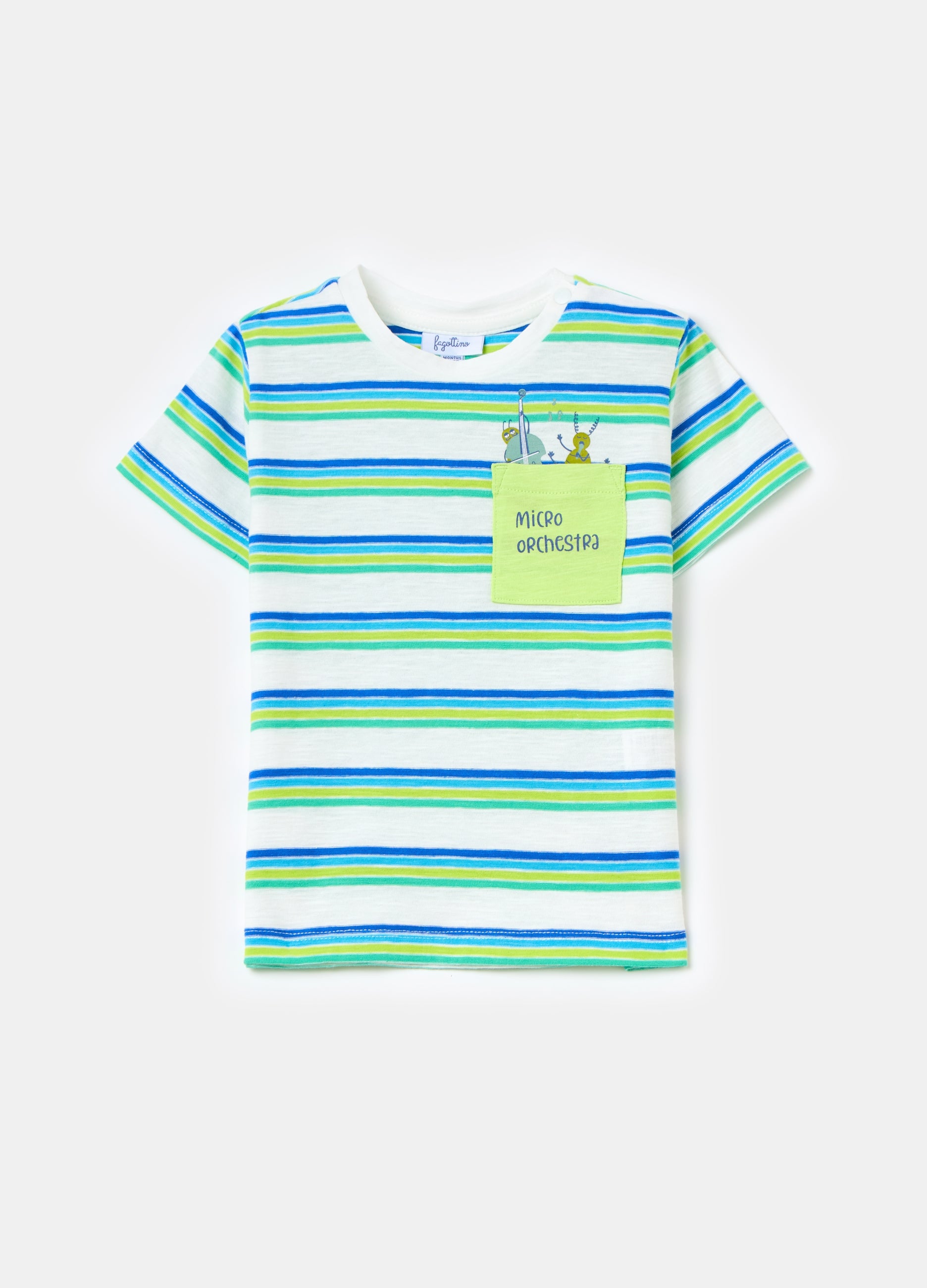 100% cotton T-shirt. Round neck with snap buttons on the shoulder. Multicoloured striped pattern. Patch pocket on the chest with musical insects and lettering print.