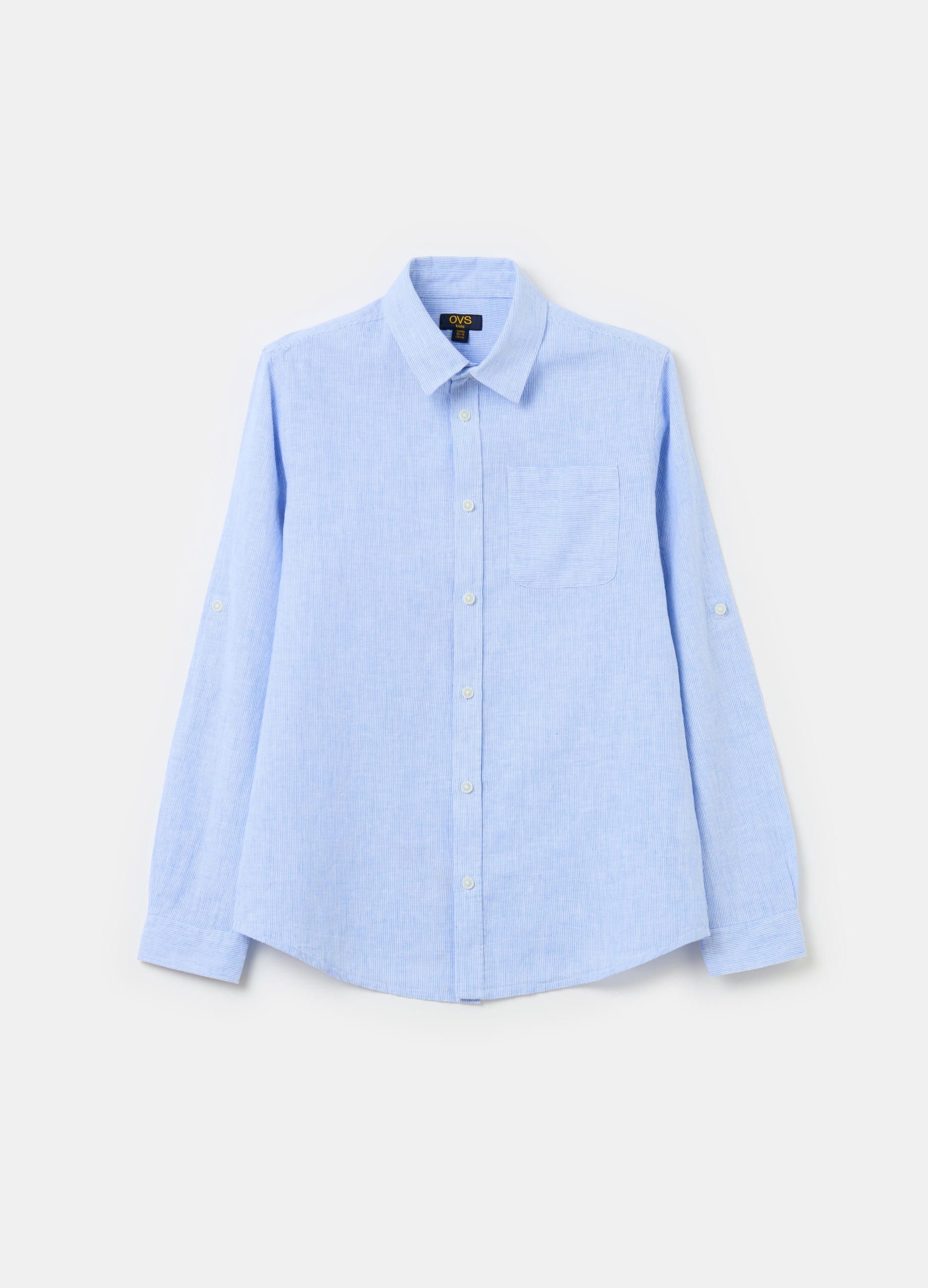 Linen and cotton shirt with slim striped pattern. Cutaway collar. Yoke on the back. Patch pocket on the chest. Sleeves with up-turned buttoned cuffs. Button fastening.
