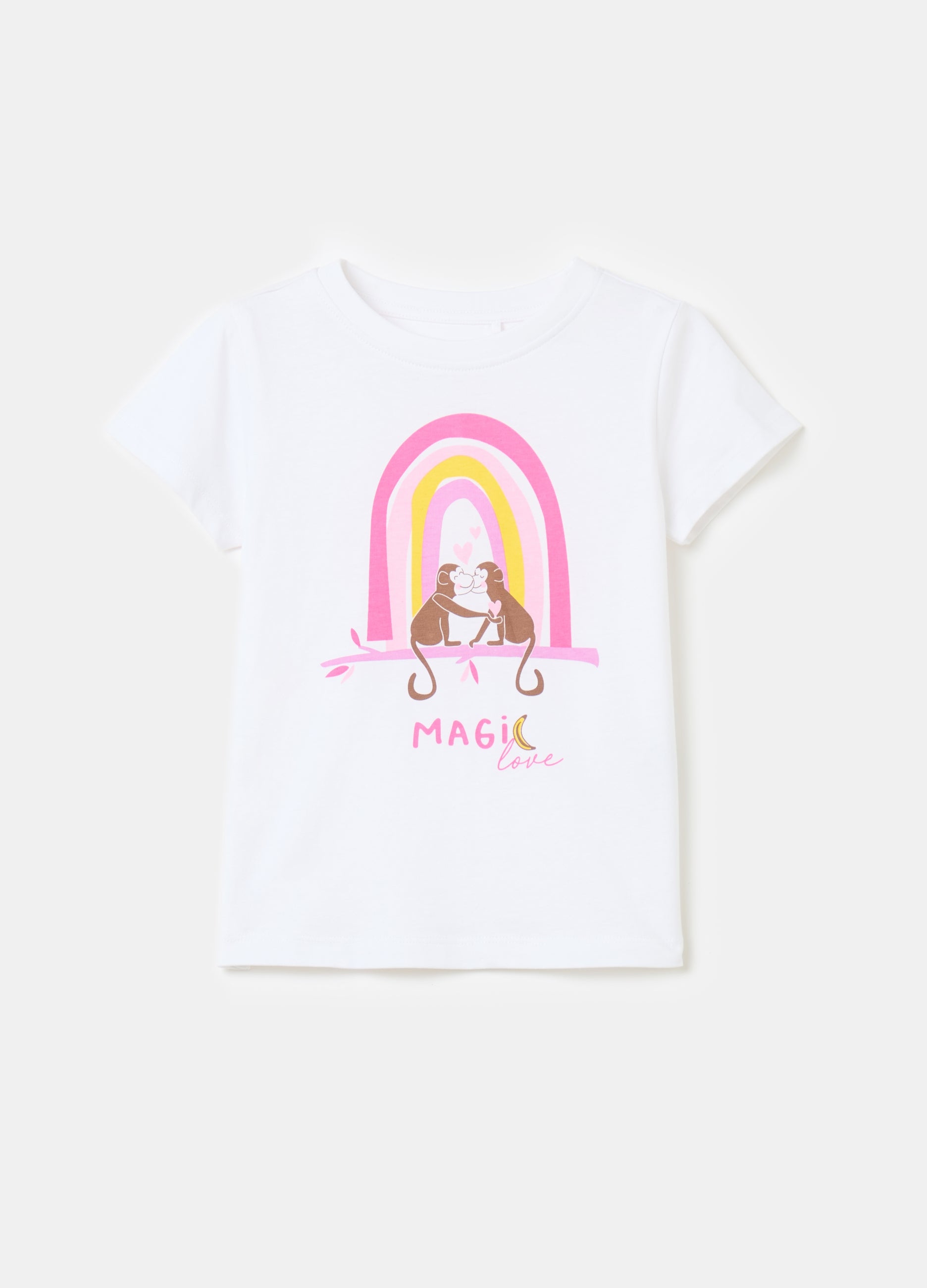 100% organic cotton T-shirt. Round neck. Monkeys in love print with rainbow and lettering on the front.