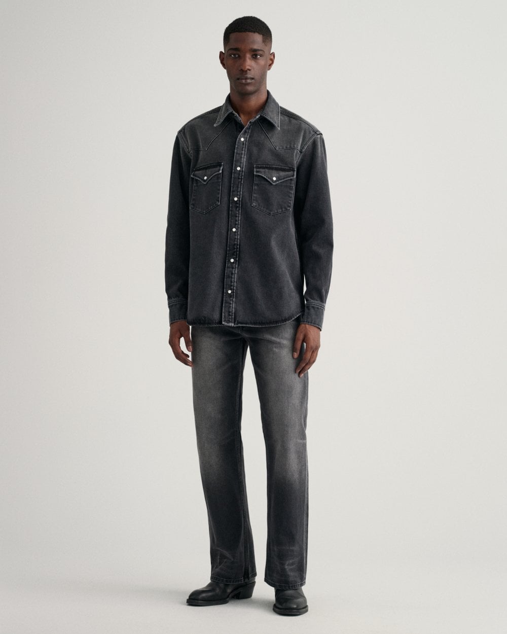 Crafted in a rigid cotton denim, these bootcut jeans are made with tearings and frays for an authentic expression. The silhouette is high waisted with a slim fit and a wide bootcut hem. Branded shank buttons and a leather logo patch at the back waistband complete the look.