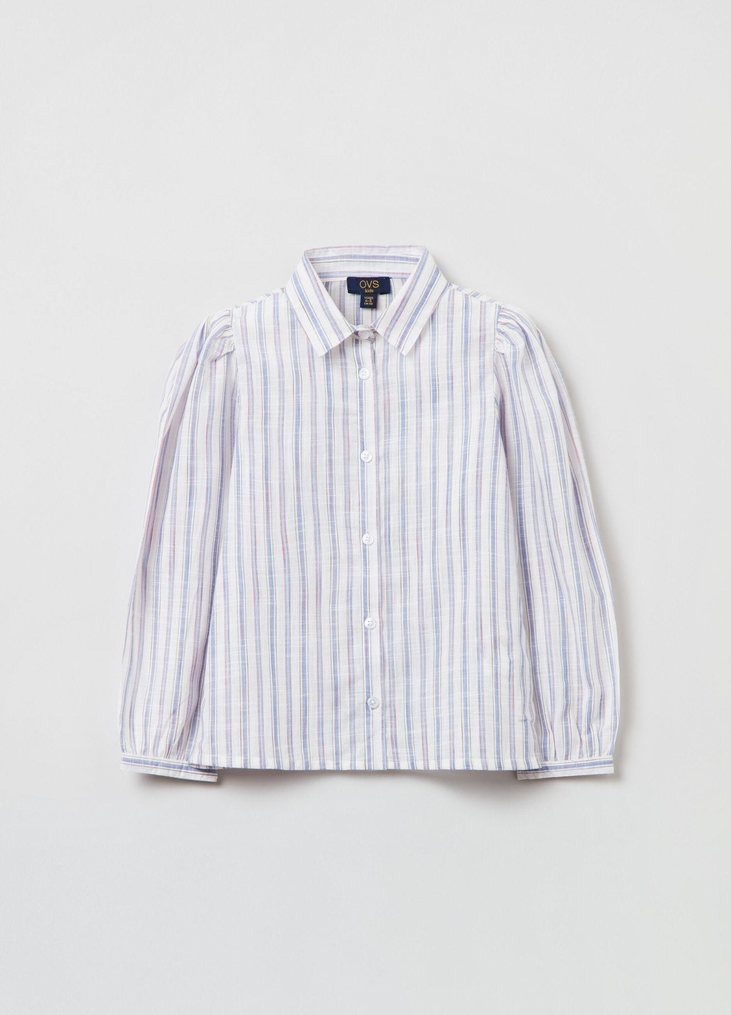 100% cotton shirt with multicoloured striped pattern. Bluff collar. Long puff sleeves. Button fastening.