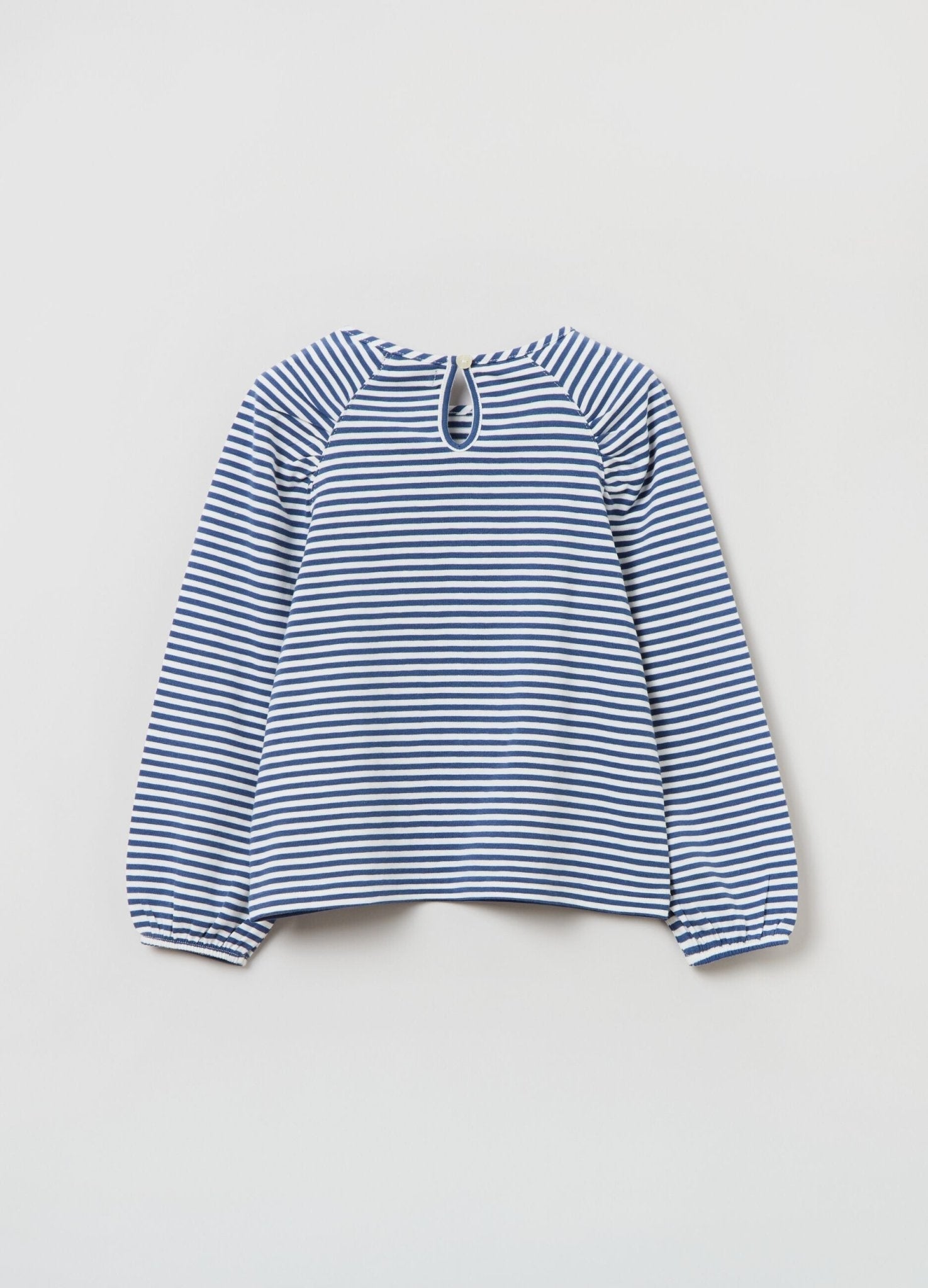 Stretch cotton striped T-shirt with round neck. Puff raglan sleeves with elasticated cuffs. Keyhole opening with button fastening on the back.