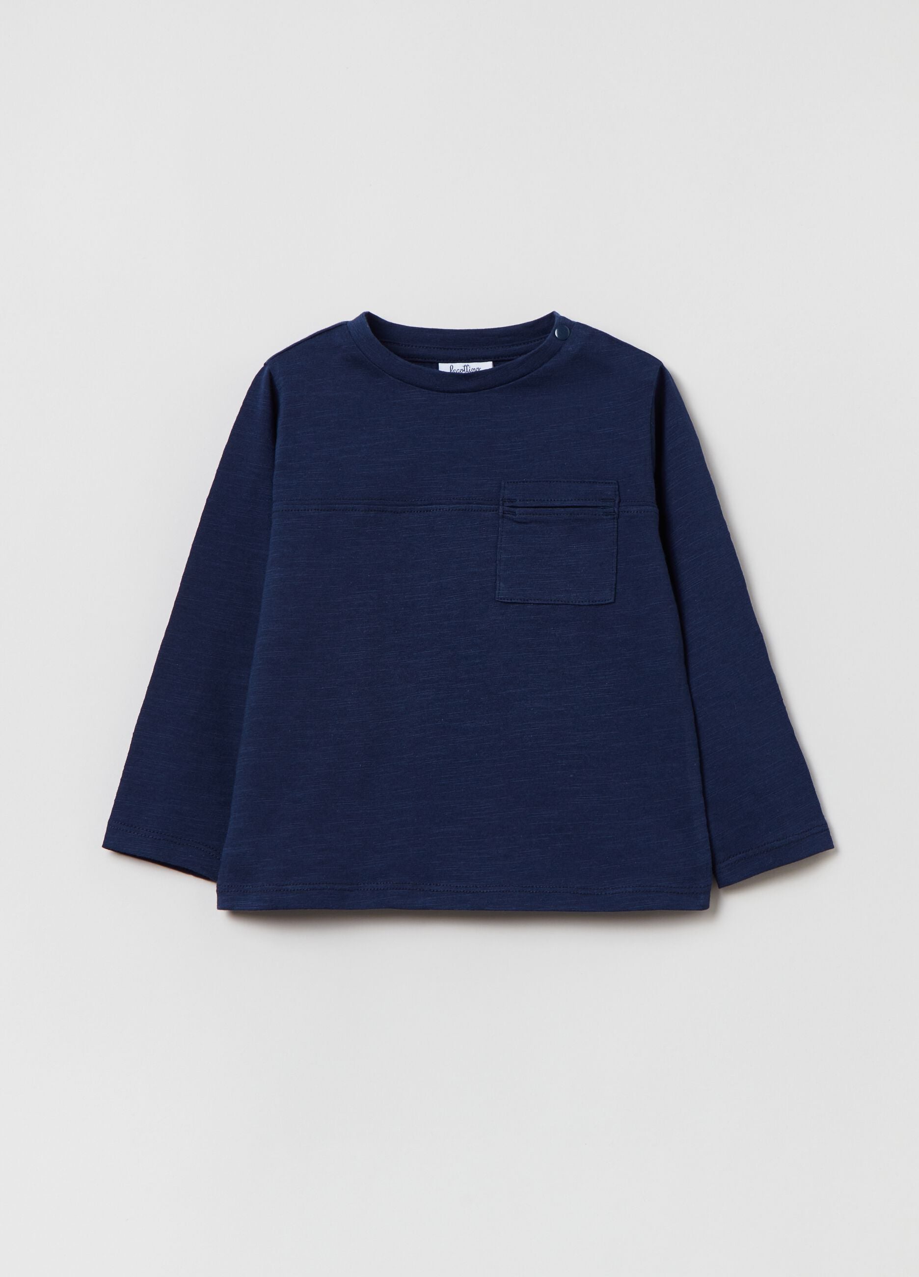 100% slub cotton T-shirt with long sleeves. Round neck with snap buttons on the shoulder. Patch pocket on the chest.
