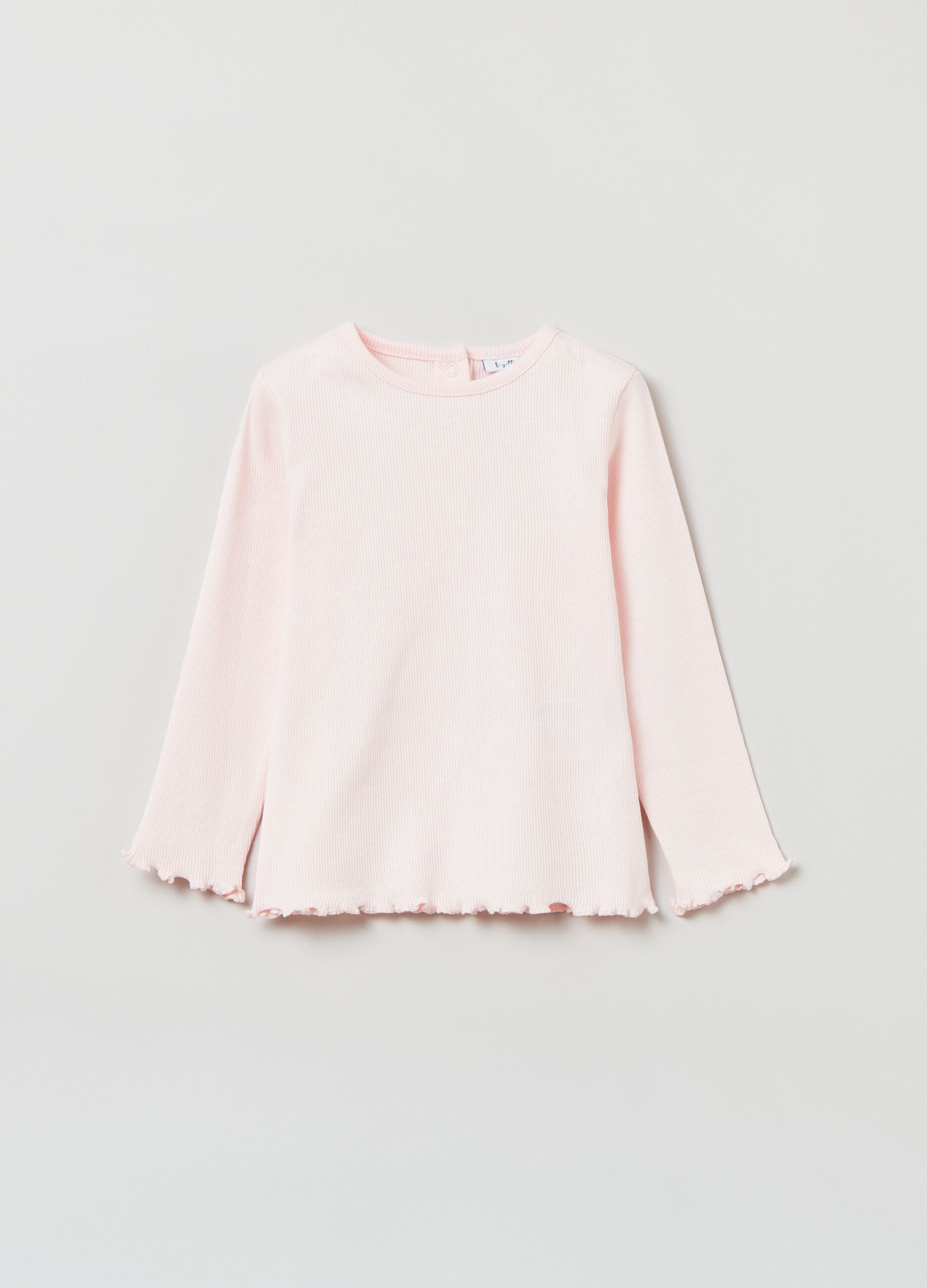 Long-sleeved T-shirt in ribbed stretch cotton. Round neck with snap button fastening on the back. Wavy trim on sleeves and hem.