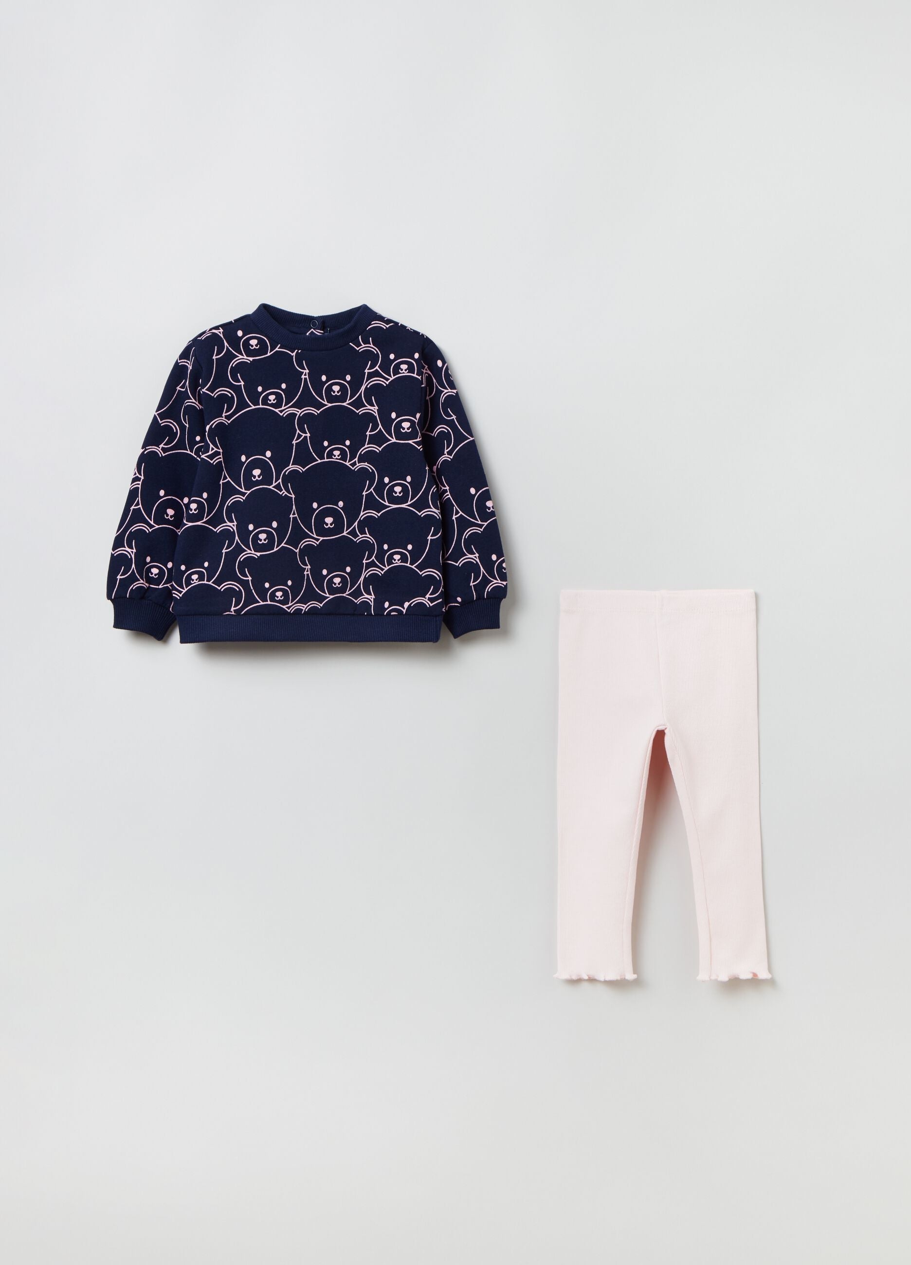 Stretch cotton jogging set. Round neck sweatshirt with all-over teddy bears print. Press-stud fastening on the back. Ribbed neck, cuffs and hem. Ribbed leggings with wavy hem.