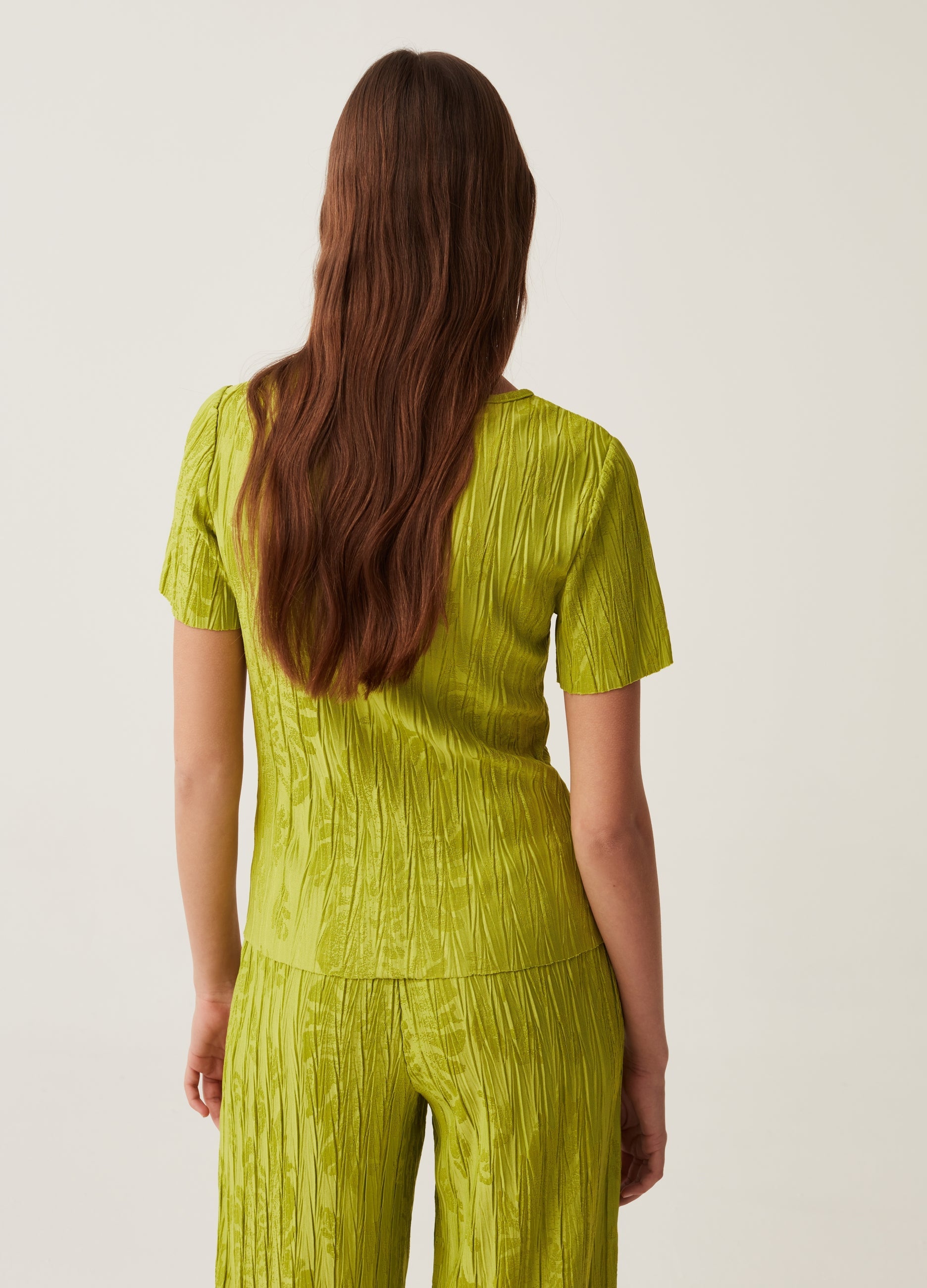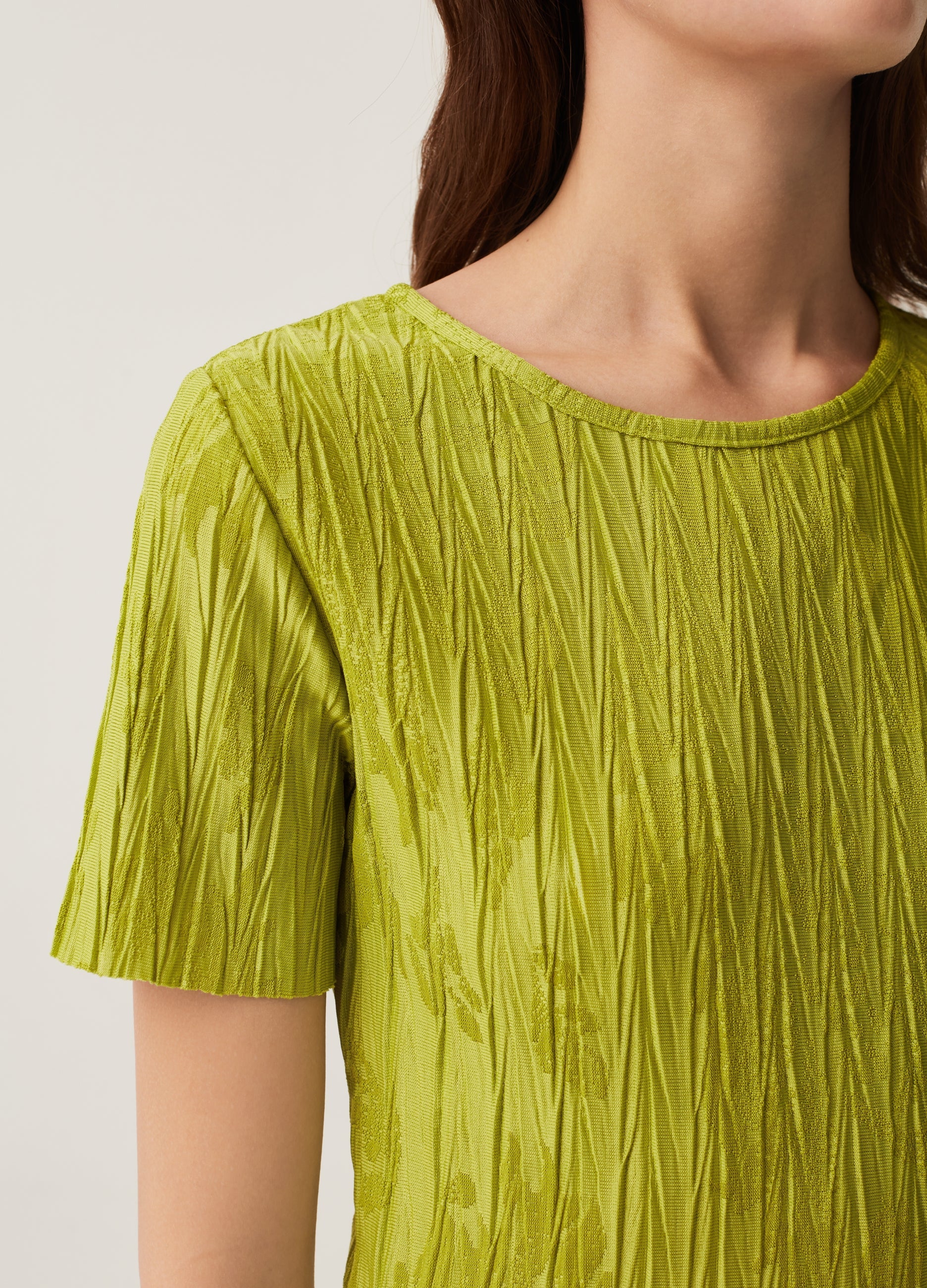 T-shirt with round neck and pleating. Jacquard design with foliage motif.