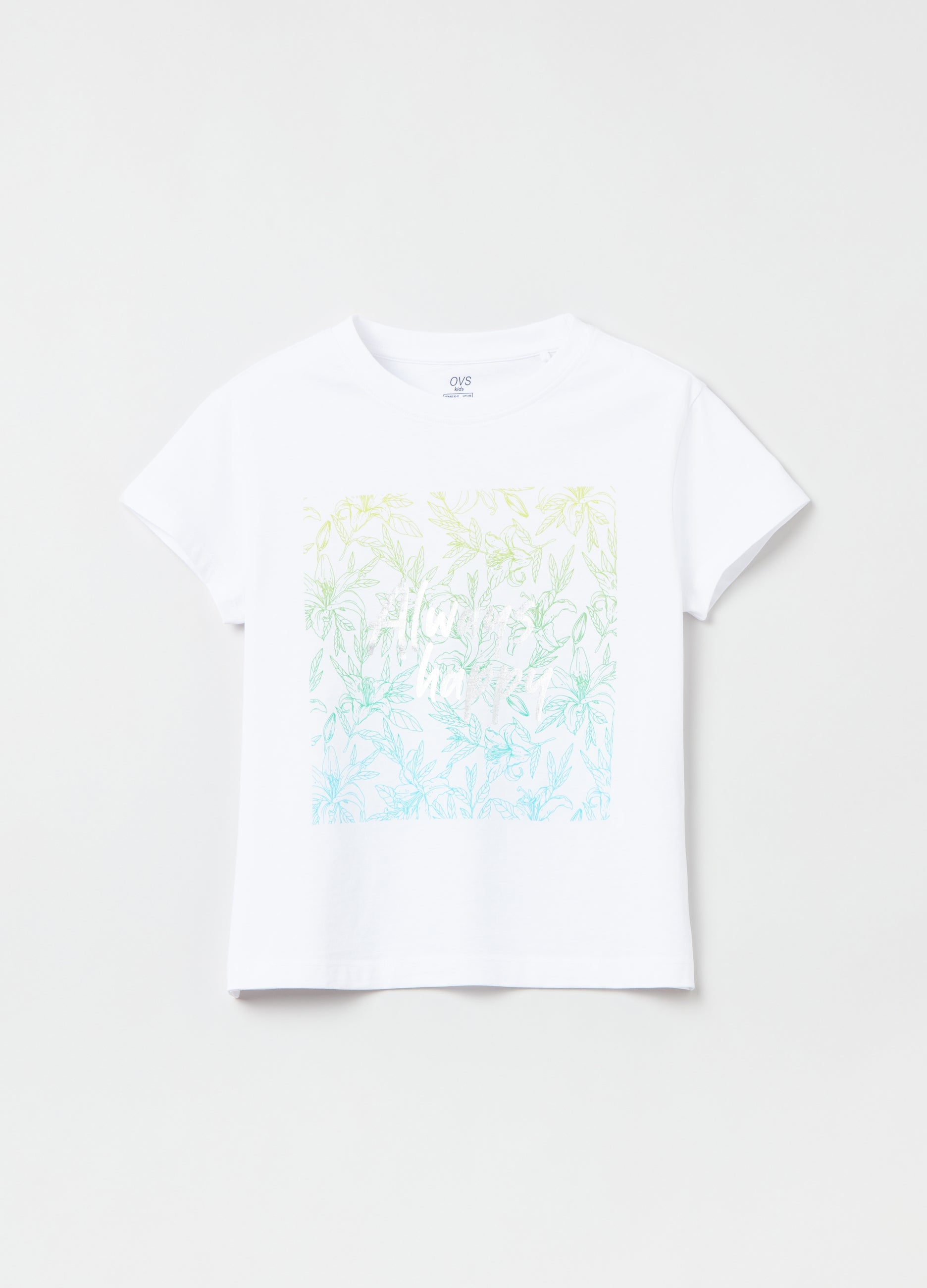 100% cotton T-shirt. Round neckline. Foil print and writing in foil on the front.