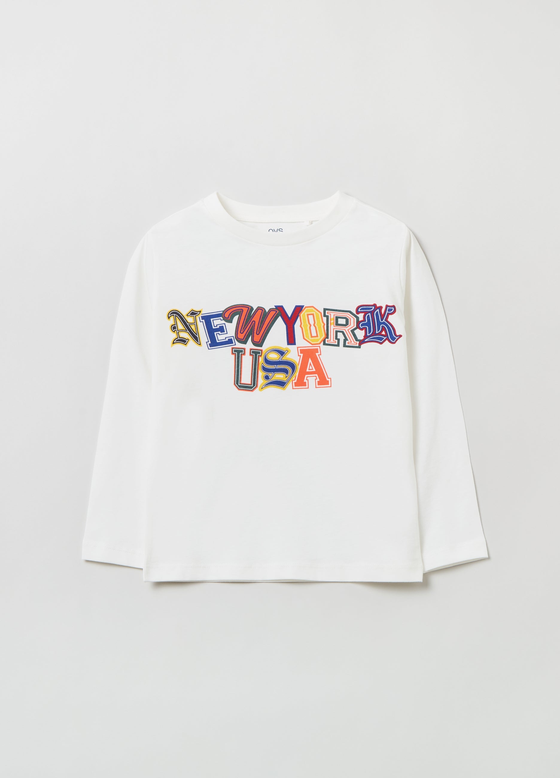 100% cotton T-shirt with long sleeves. Round neck. Multicoloured printed lettering on the chest.