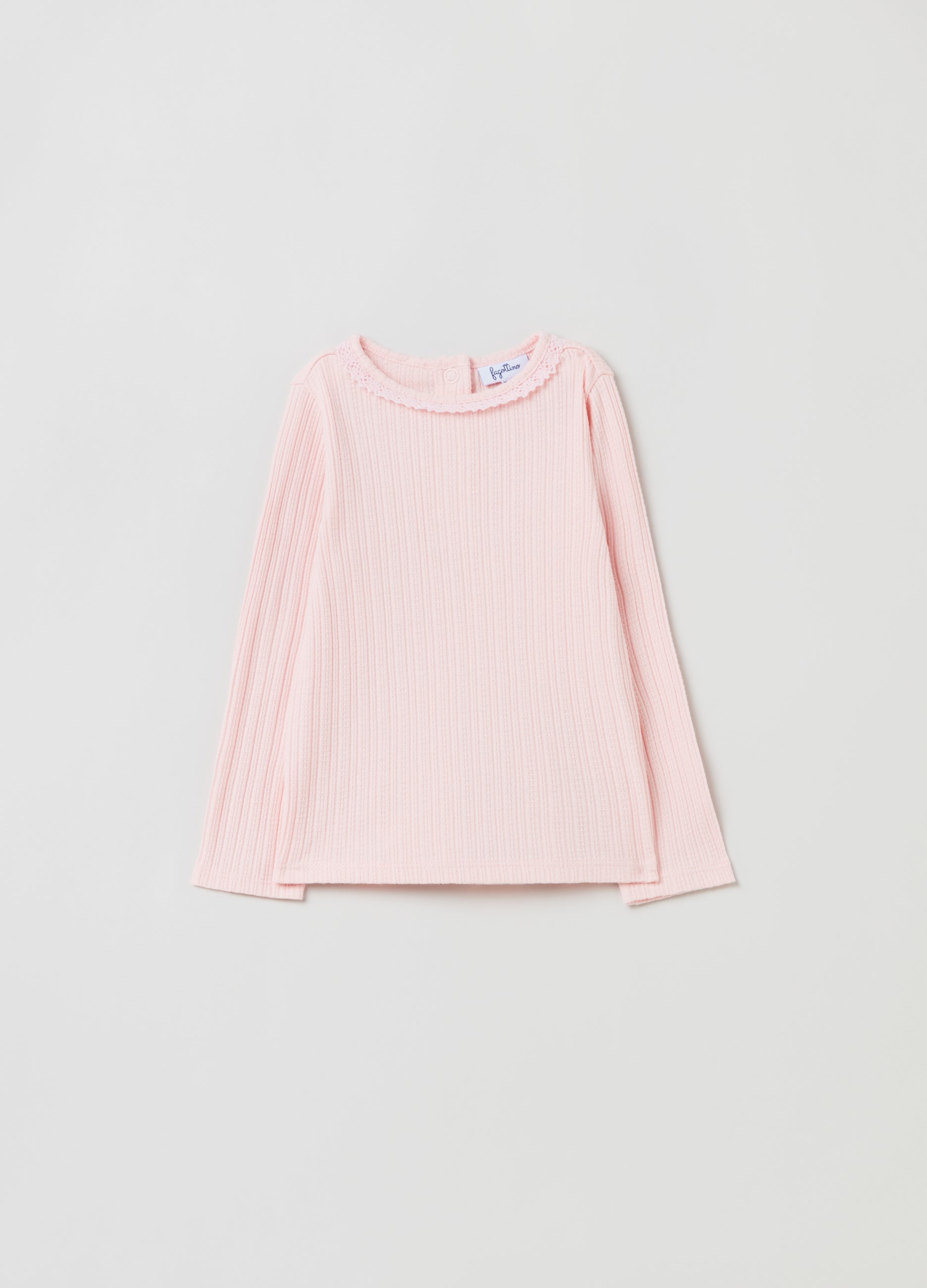 Long-sleeved ribbed T-shirt in 100% cotton blend with pointelle detailing. Round neck with braid trim. Snap button fastening on the back.