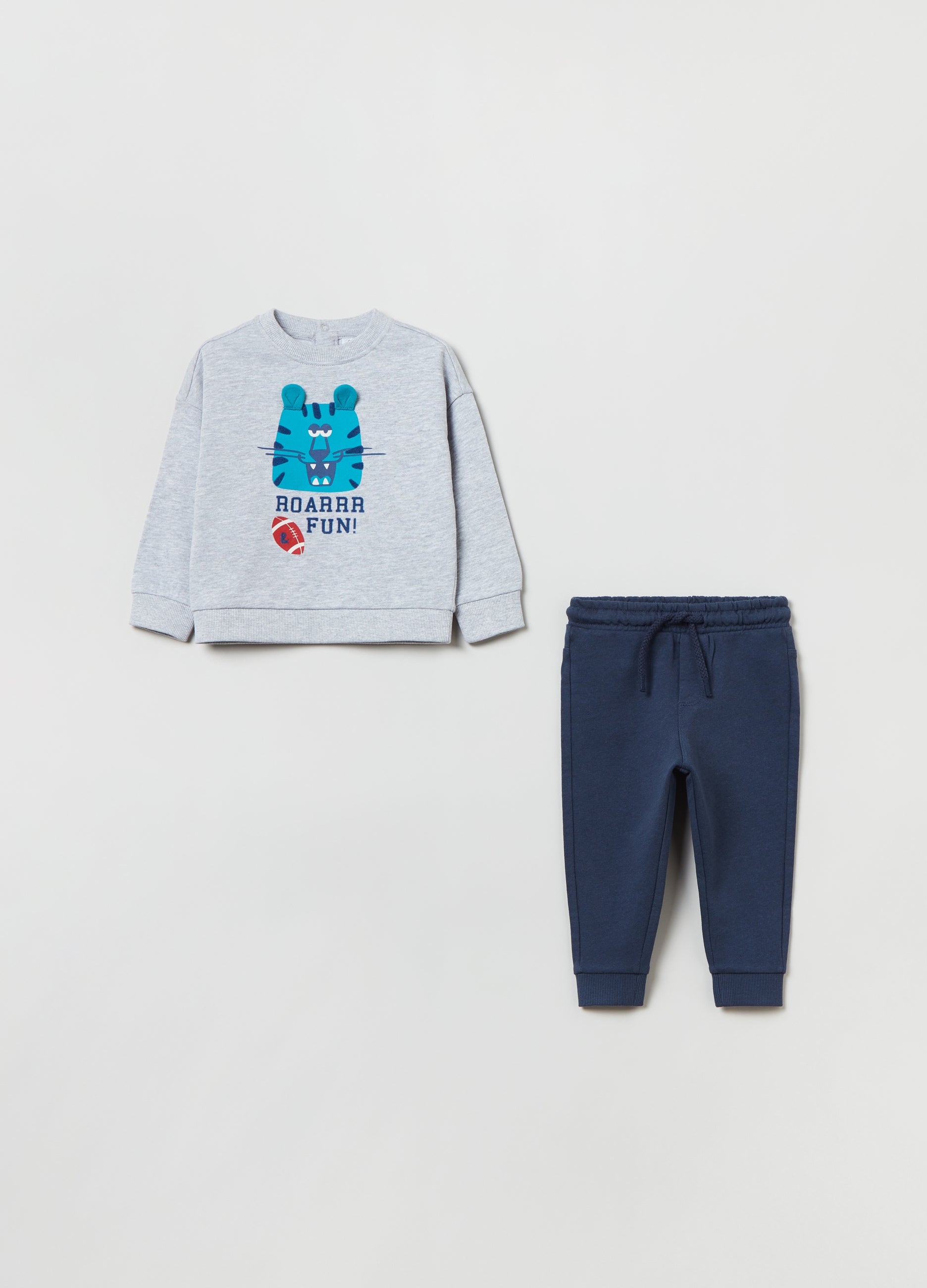 French terry jogging set (non-brushed fleece lining) consisting of top in mélange viscose and cotton and joggers in 100% cotton. Top with round neck and snap buttons on the back. Oversized fit and drop shoulders. Tiger print with applied ears and lettering. Ribbed trims. Solid colour joggers with drawstring. Ribbed ankle cuffs.