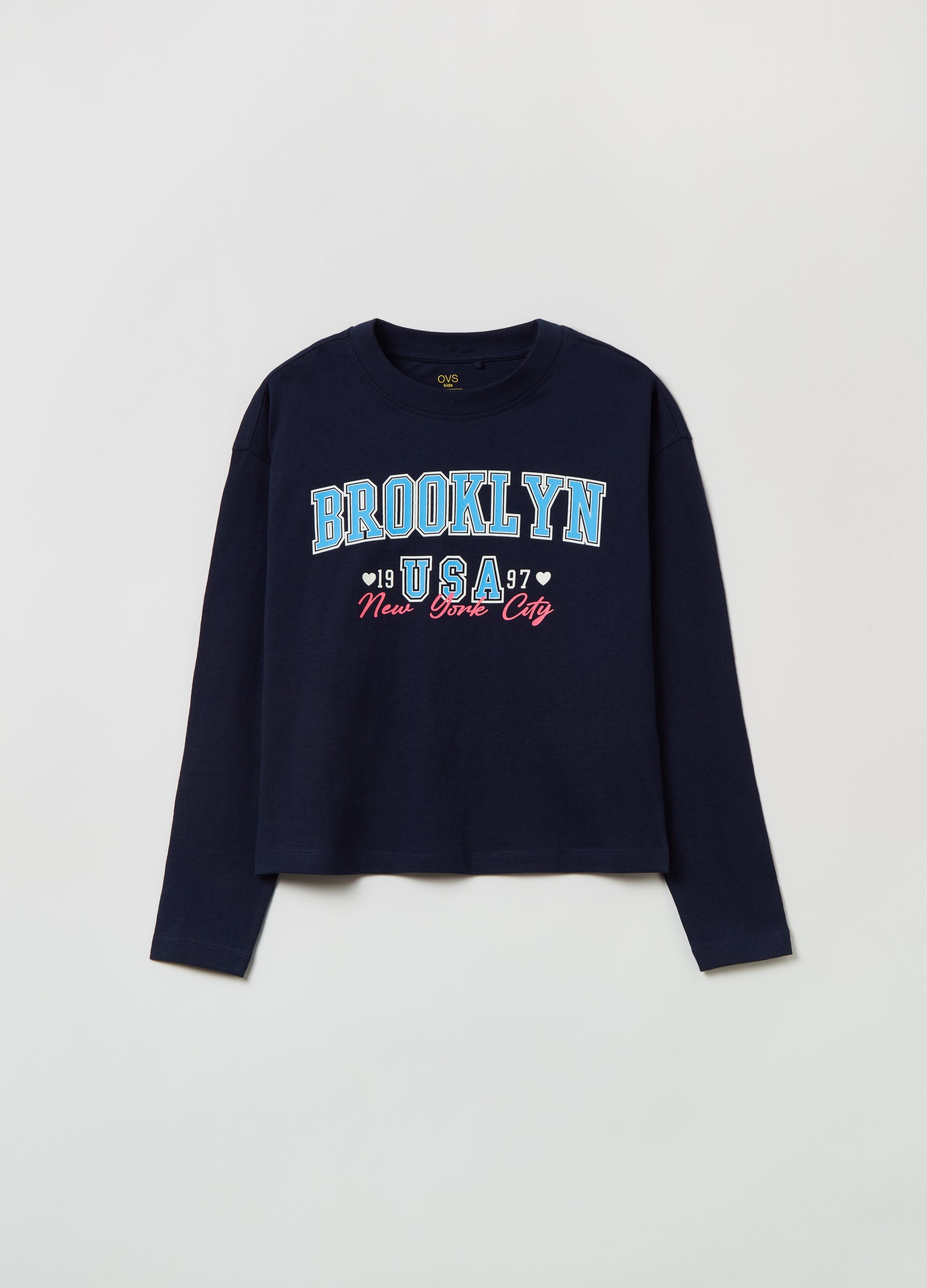 100% cotton T-shirt with long sleeves. Round neck. Drop shoulders. Printed lettering on the chest.