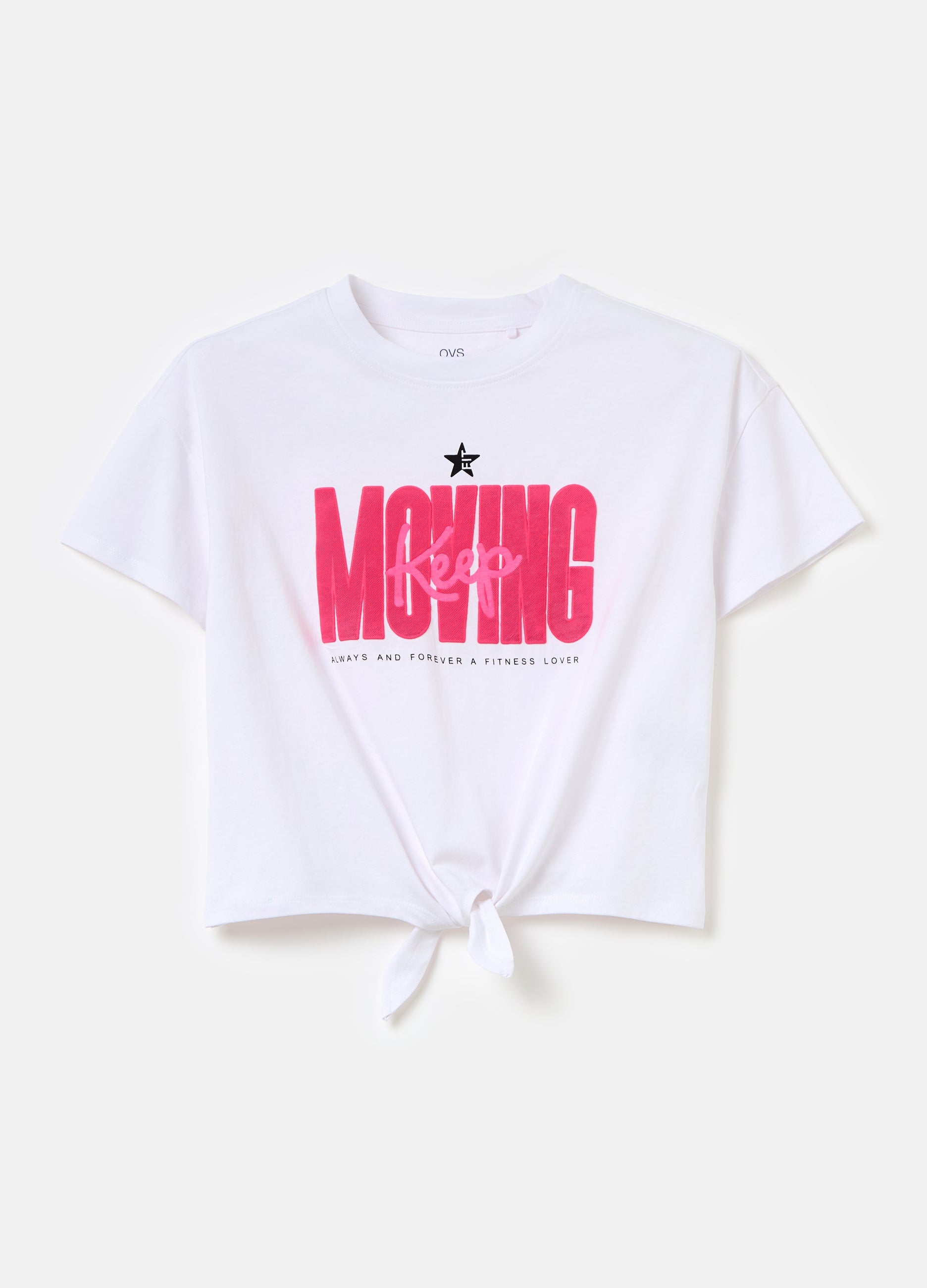 CROPPED T-SHIRT IN 100% COTTON WITH KNOT ON THE HEM. ROUND NECK. LETTERING PRINT WITH STAR ON THE FRONT.