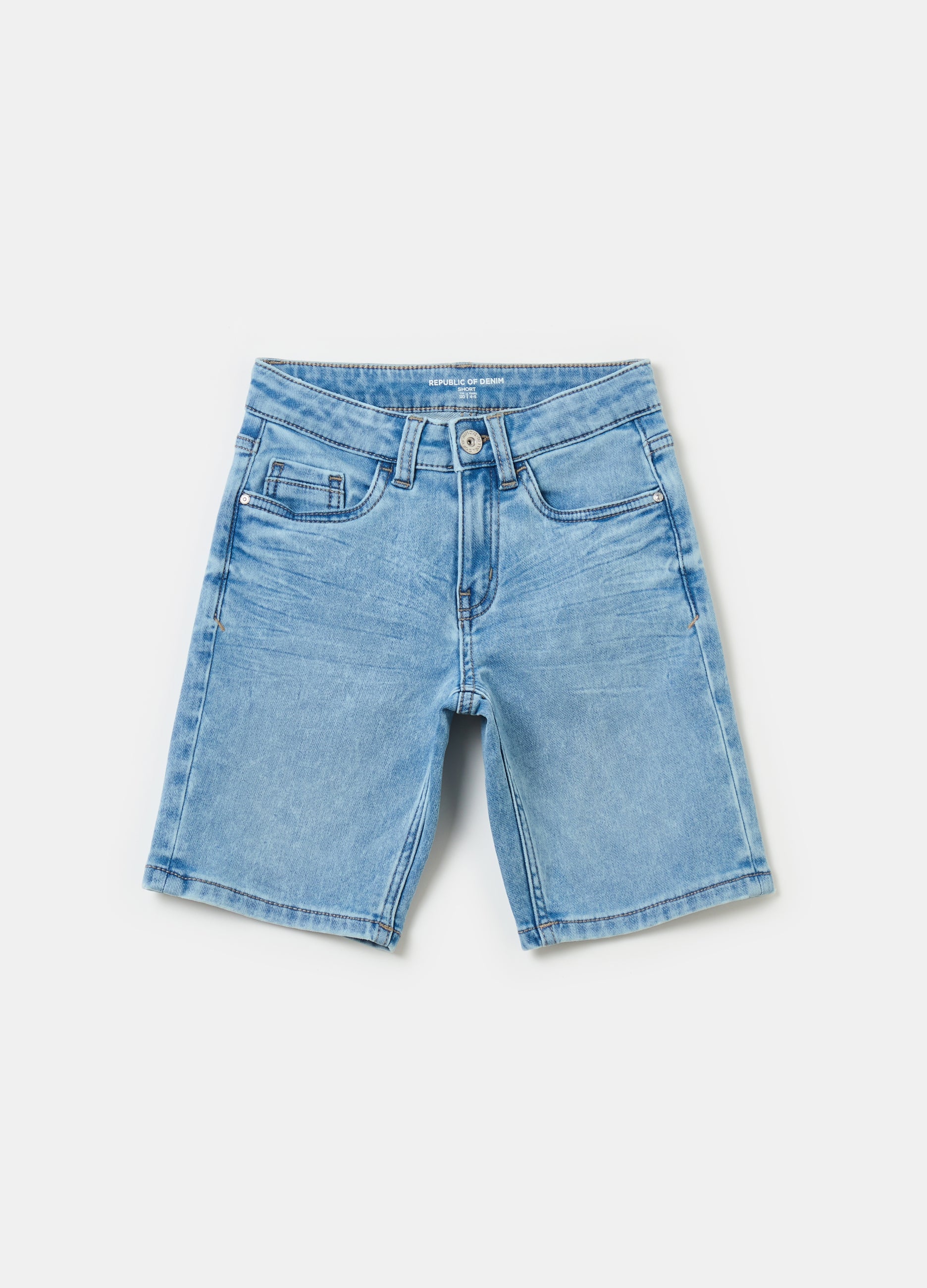Creased-effect Bermuda shorts in stretch cotton blend denim. Internal waist adjustment. Five pockets. Zip and snap-button fastenings.
