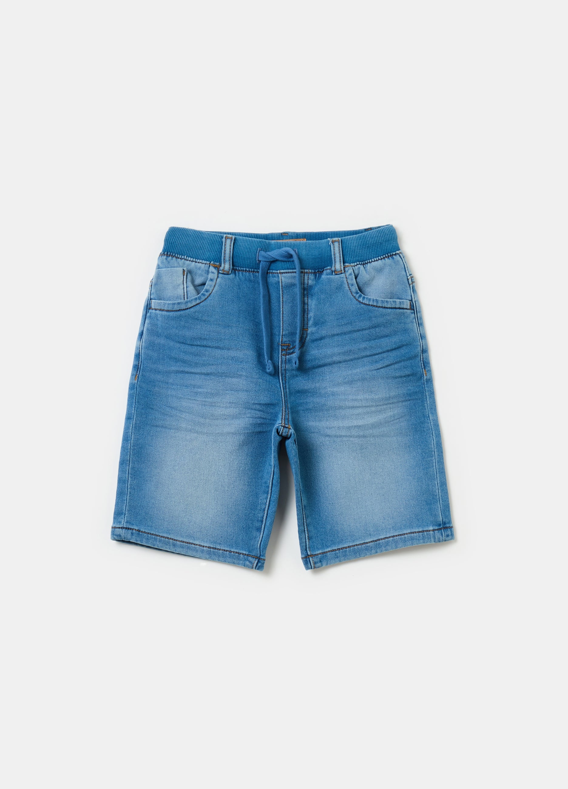 Stretch cotton blend French terry denim Bermuda shorts (non-brushed fleece lining). Stretch waist with sash drawstring. Five pockets.