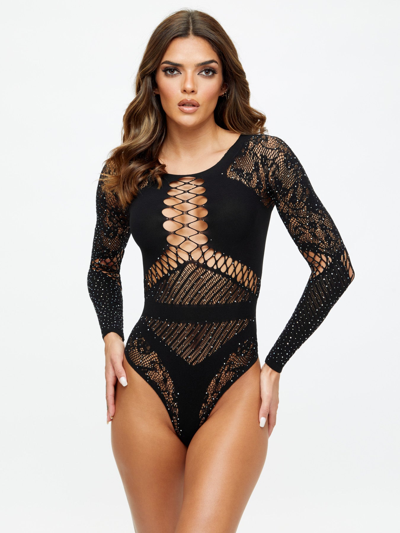 Take centre stage in our Paisley Body. Made from seamless stretch fabric with iridescent diamante, it features denser panelling over the bust and lower half of the bodice and sheer floral panels on the arms and hips. The centre front features cut out detail that leads round to the back which is cut to a Brazilian shape for an alluring finish. Style yours with a pair of our PU leggings or a figure-hugging skirt for a seductive evening look. Take a look at our going out collection to update your wardrobe or find something seductive for a night in with our lingerie ranges.