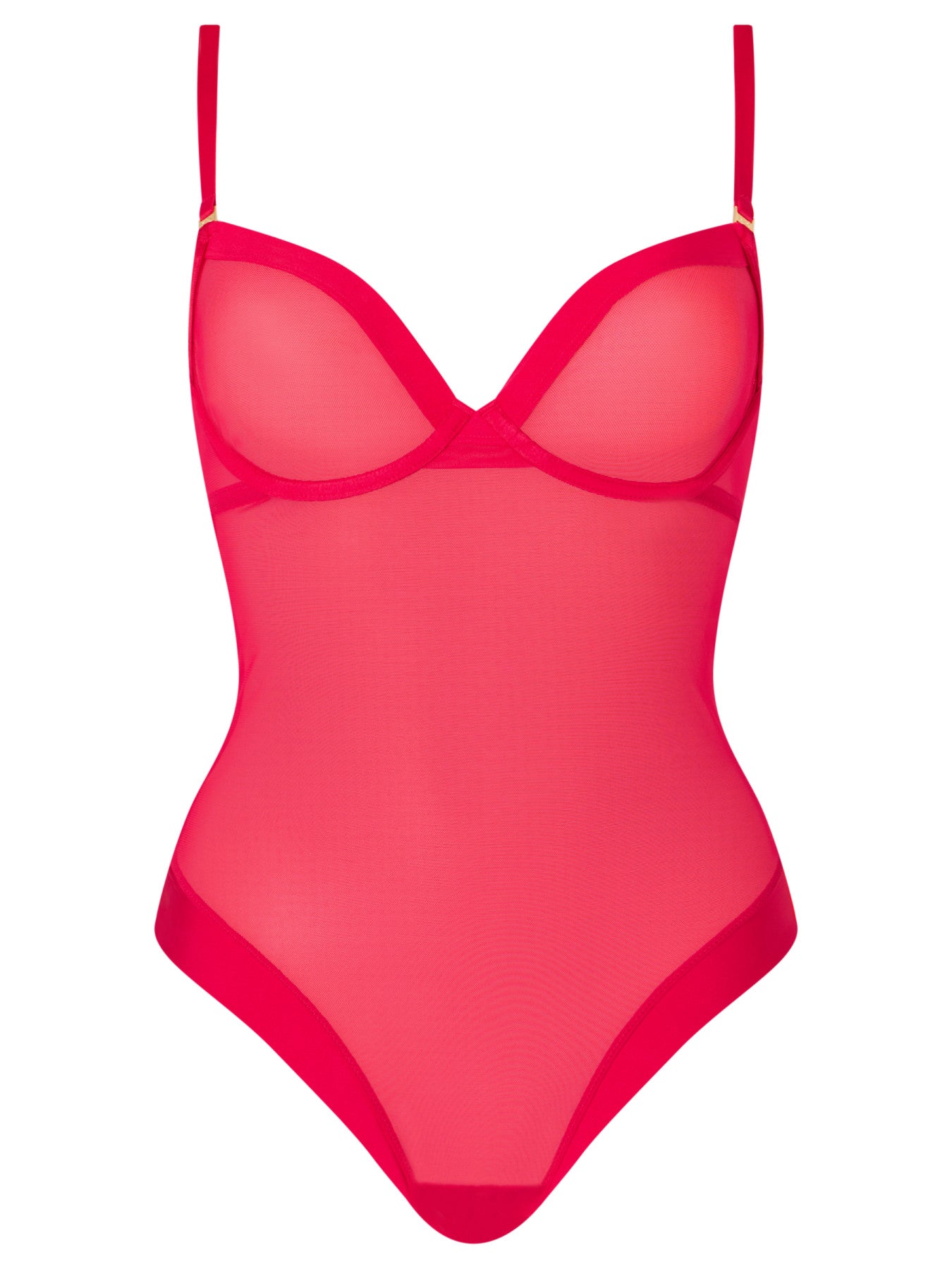 Introducing Zadie by KBX, the underwired body in a red soft mesh. Non-padded with semi-sheer cups and wired to create an uplifted and natural shape. Detailed with brushed champagne gold-toned hardware, the shoulder straps have an adjustable clasp to convert to a racerback style for multi-wear. The Zadie body is complete with microfibre fabric around the hips to ensure the thong is invisible under clothing. Nipple covers have been worn in this image.