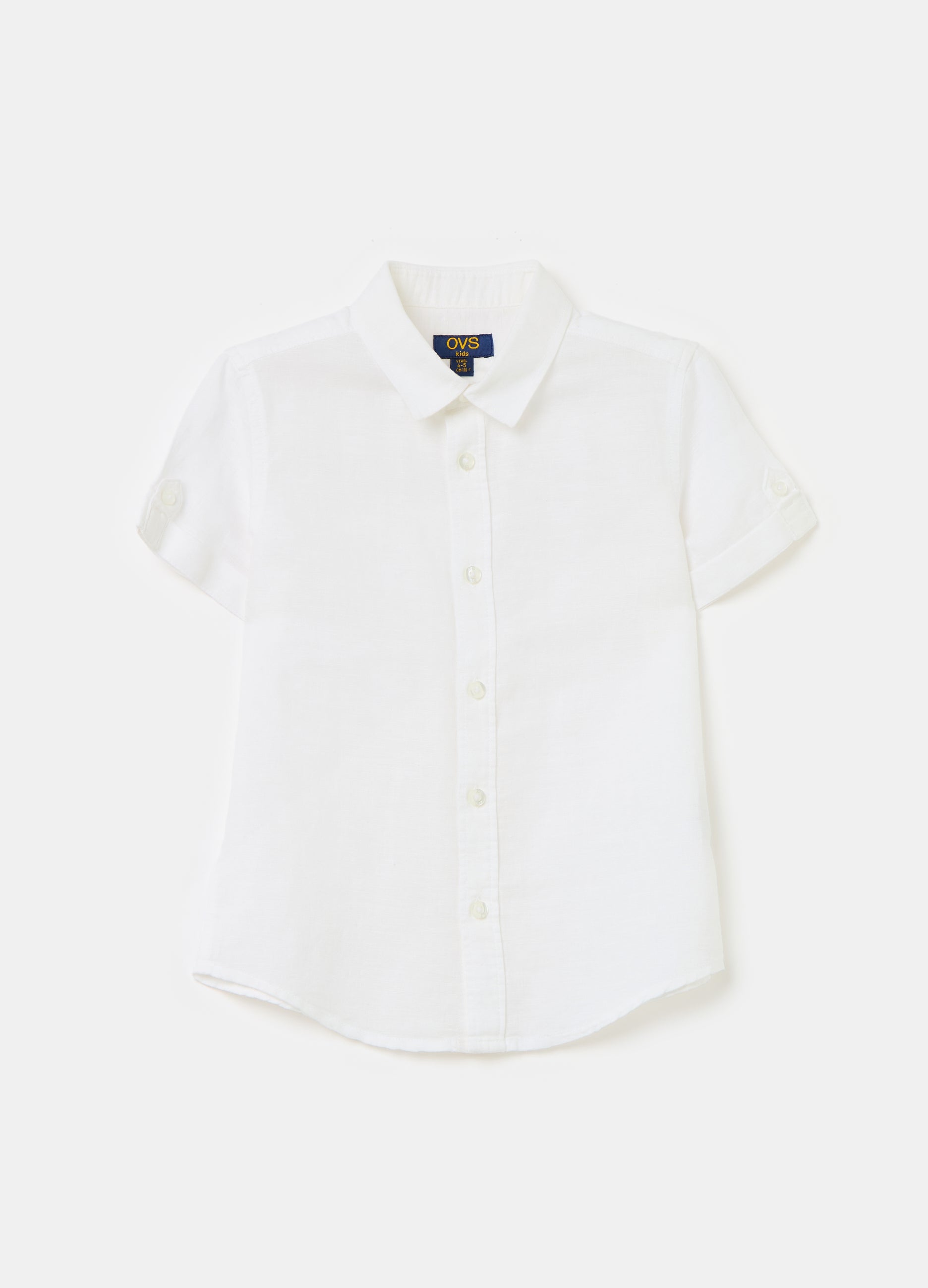 Linen and cotton shirt. Bluff collar. Yoke with placket on the back. Short sleeves with roll-sleeve tab. Button fastening.