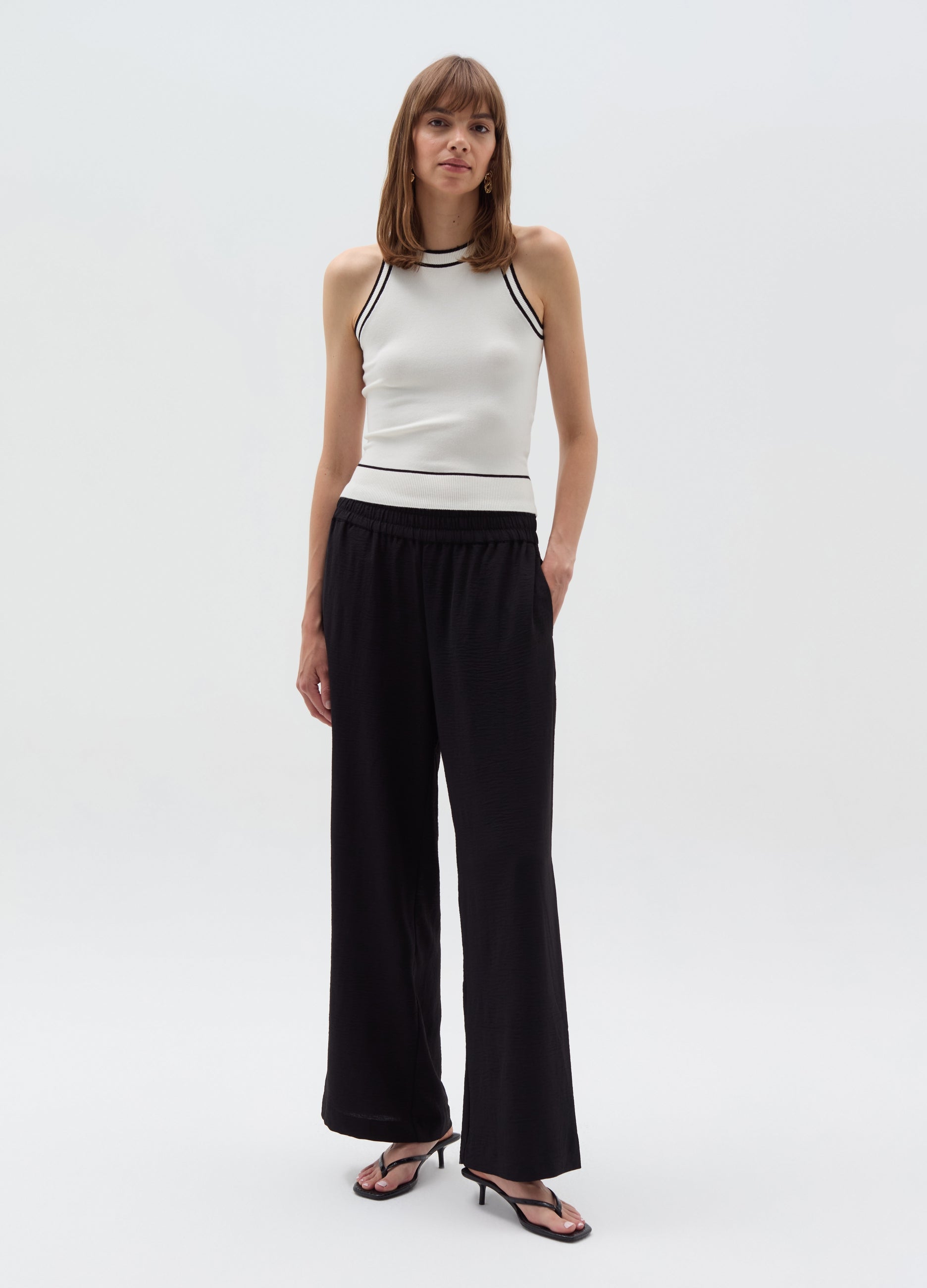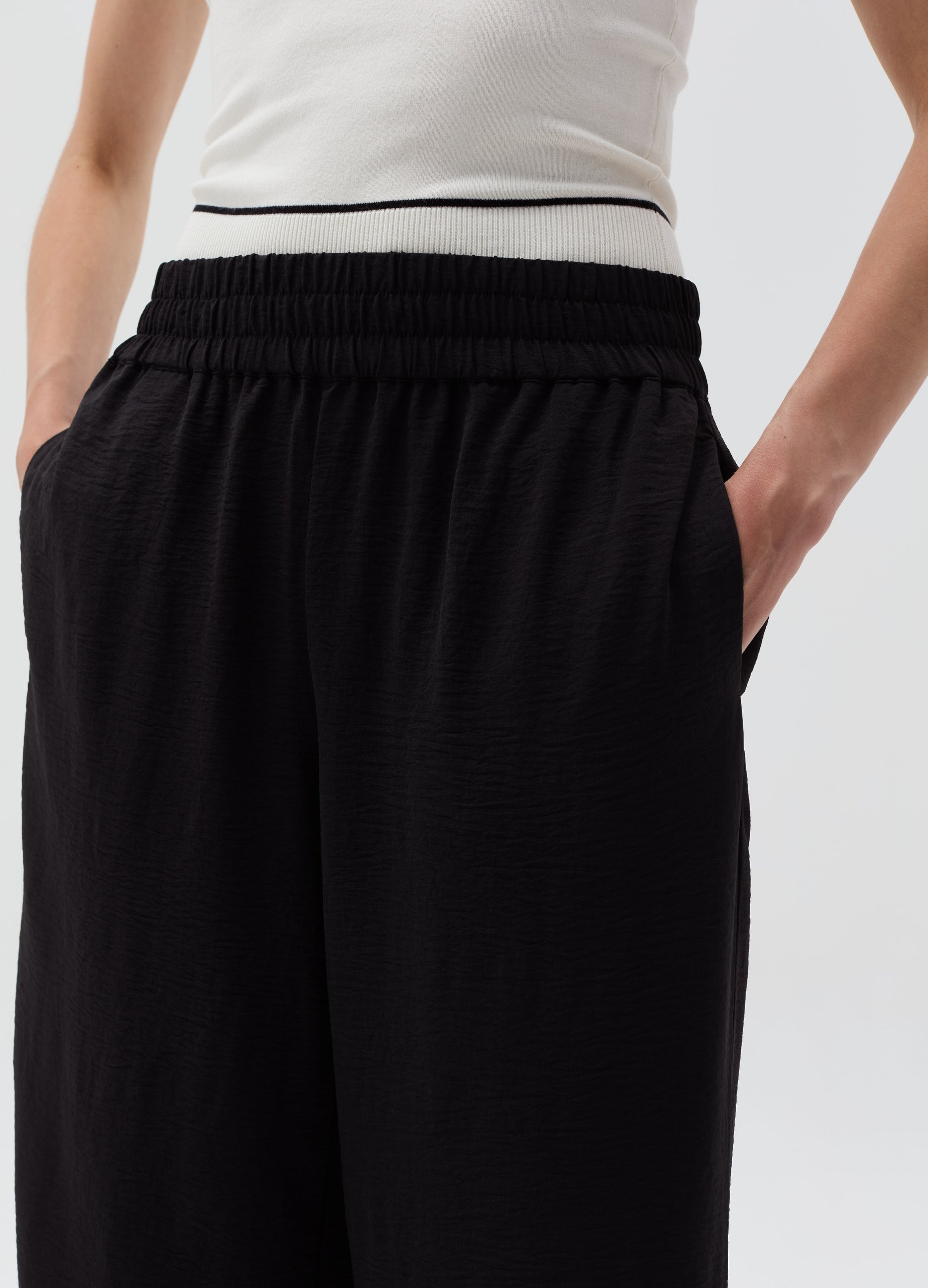 Relaxed-fit fluid trousers in crinkled-effect crêpe. Stretch waist with smock stitch. Two vertical pockets. Matching blouse available.
