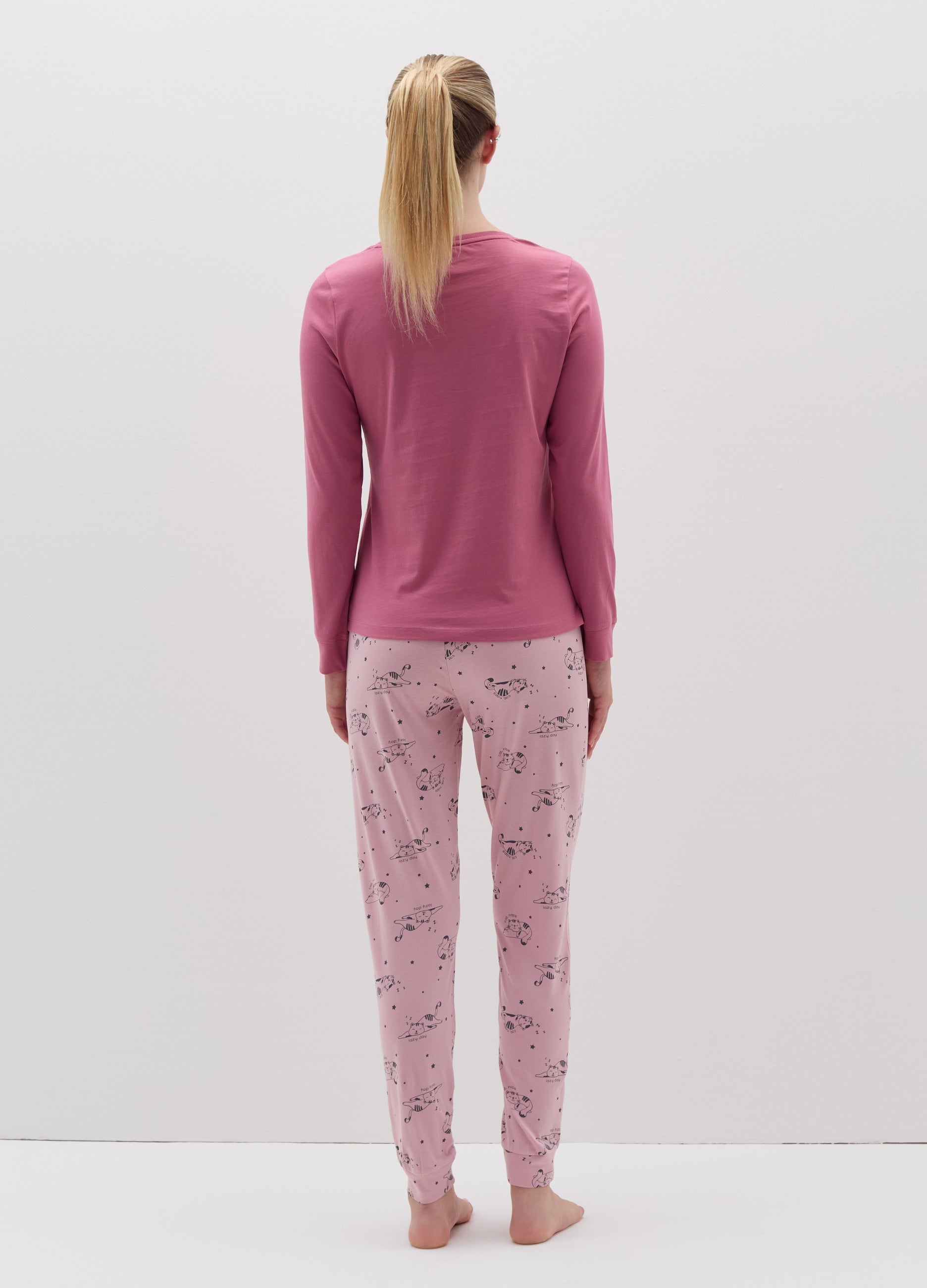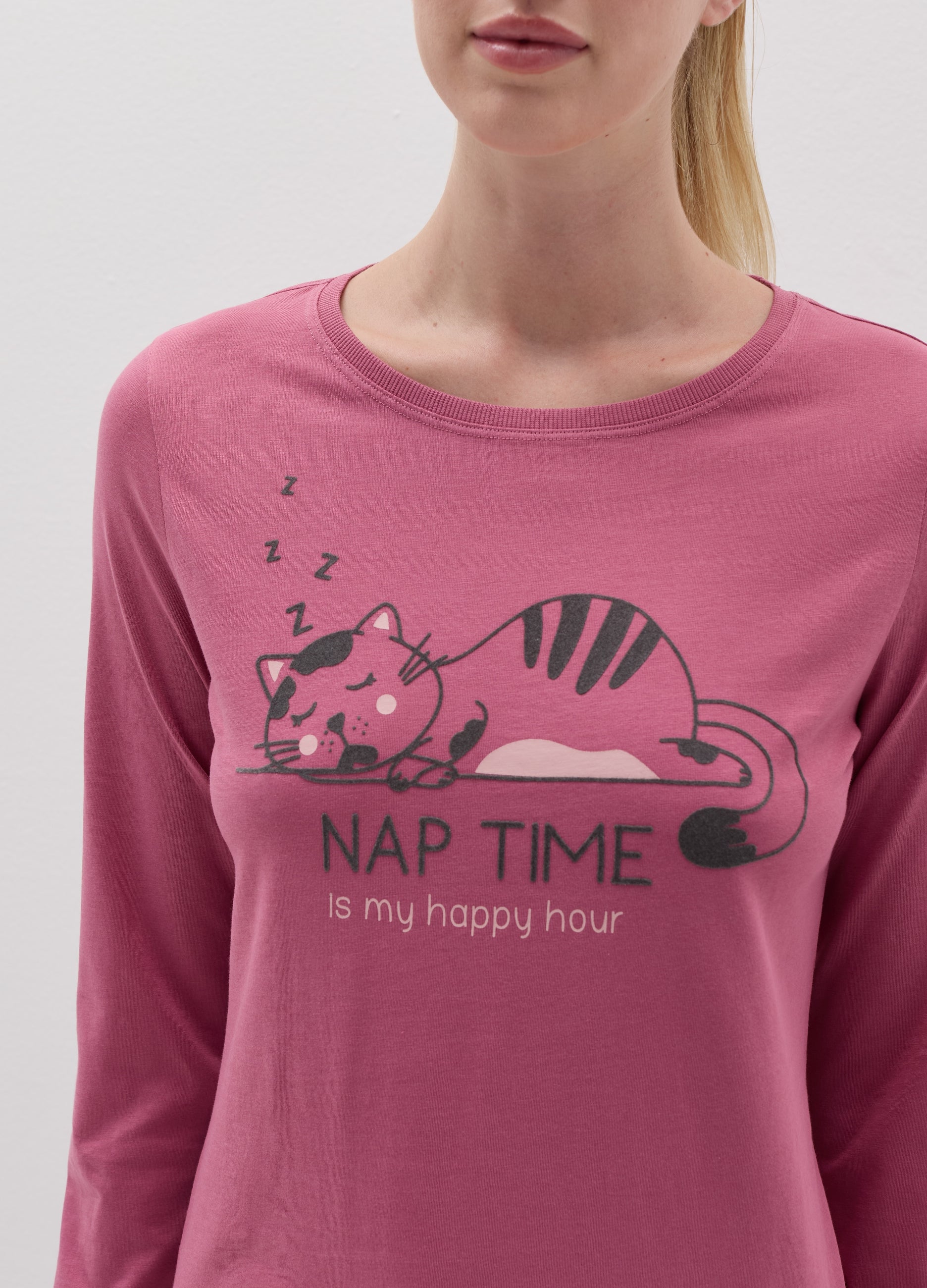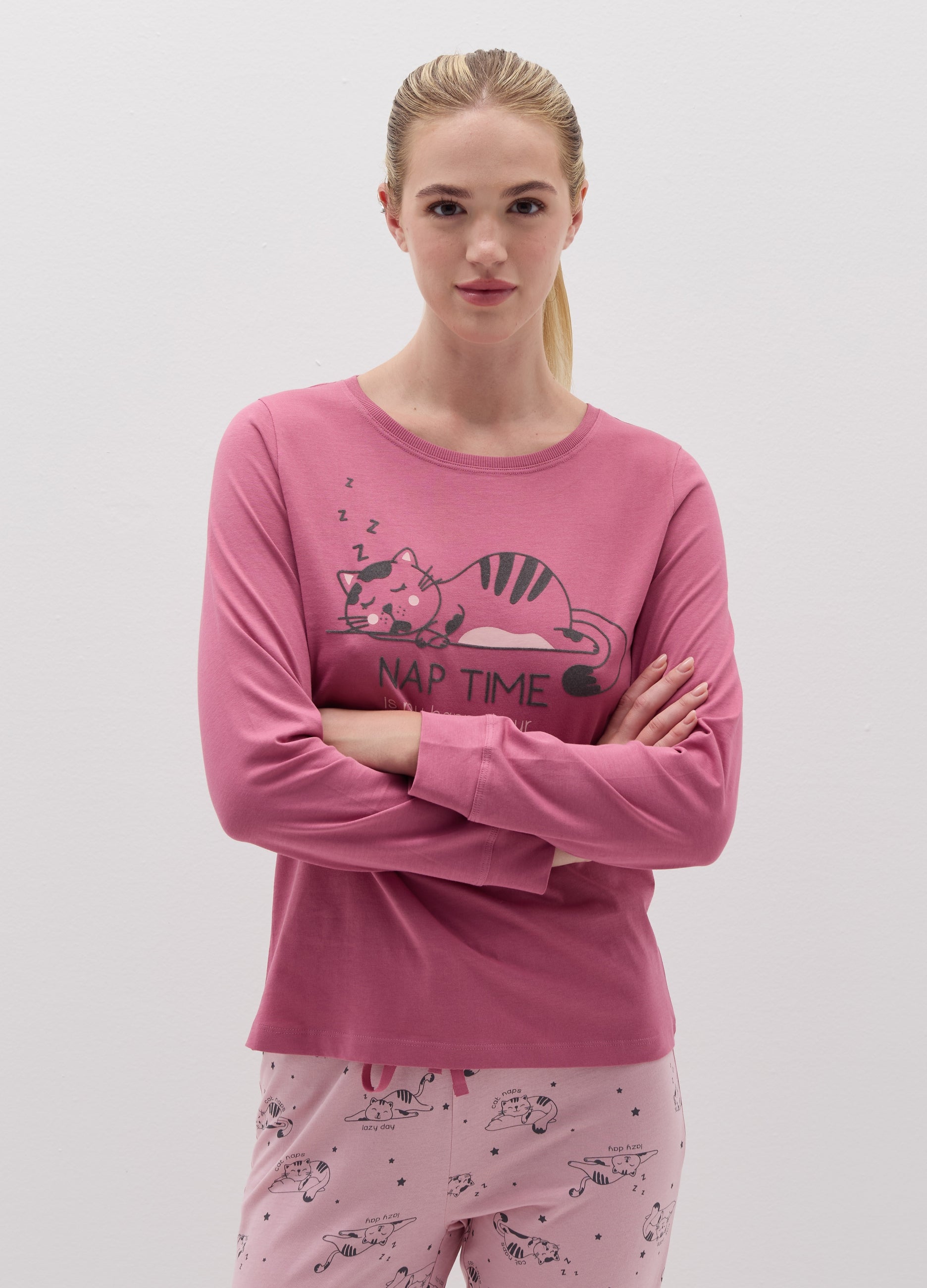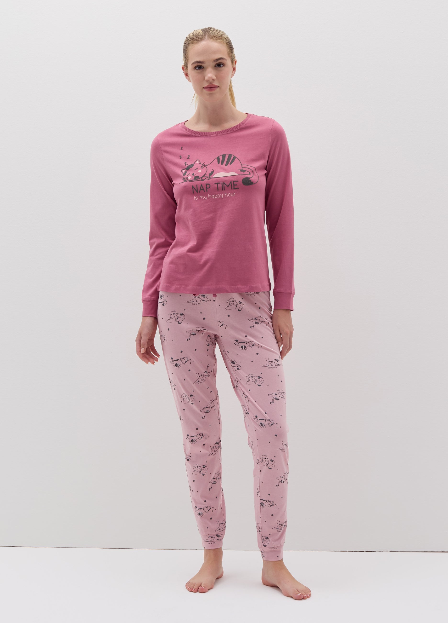 Long pyjamas in 100% organic cotton. Top with round neck. Sleeping kitten print with lettering on the front. Trousers with in satin drawstring at the waist. All-over sleeping kitten print.