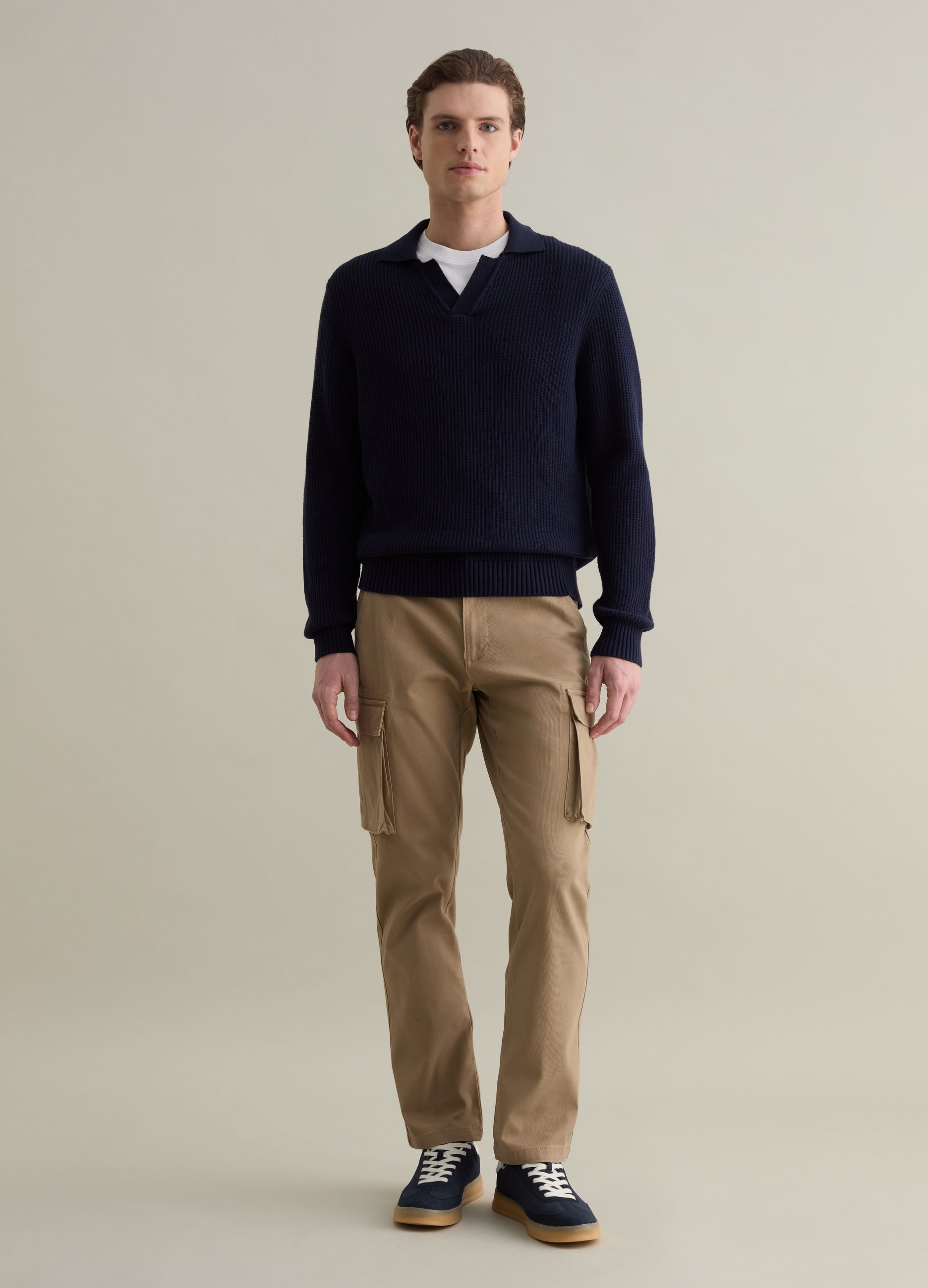 Piombo cargo trousers in stretch cotton piquet. Two vertical pockets, two pockets with flap on the back, and two pockets with flap on the sides. Zip and button fastening.