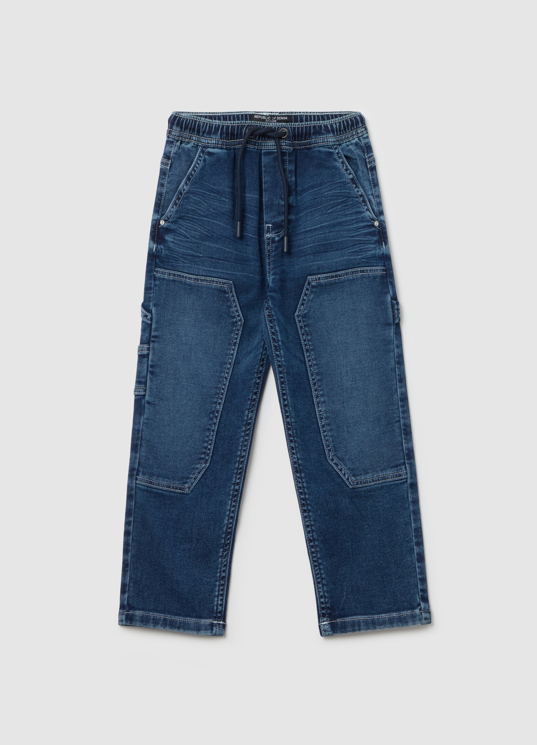Worker joggers in stretch cotton blend denim. Elasticated waist with cord drawstring. Two slant pockets and two patch pockets on the back and one patch pocket on the side. Matching patches on the front.